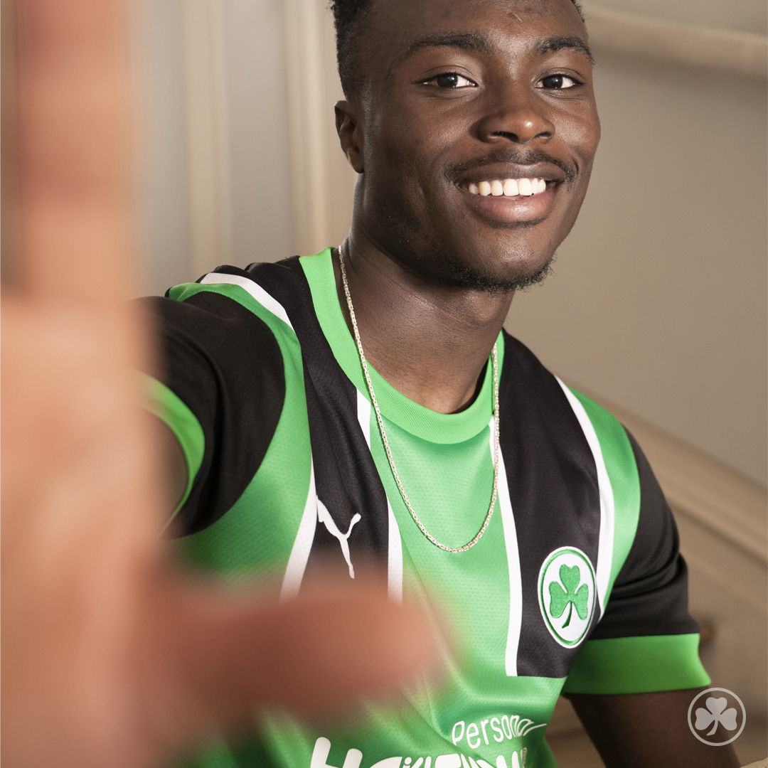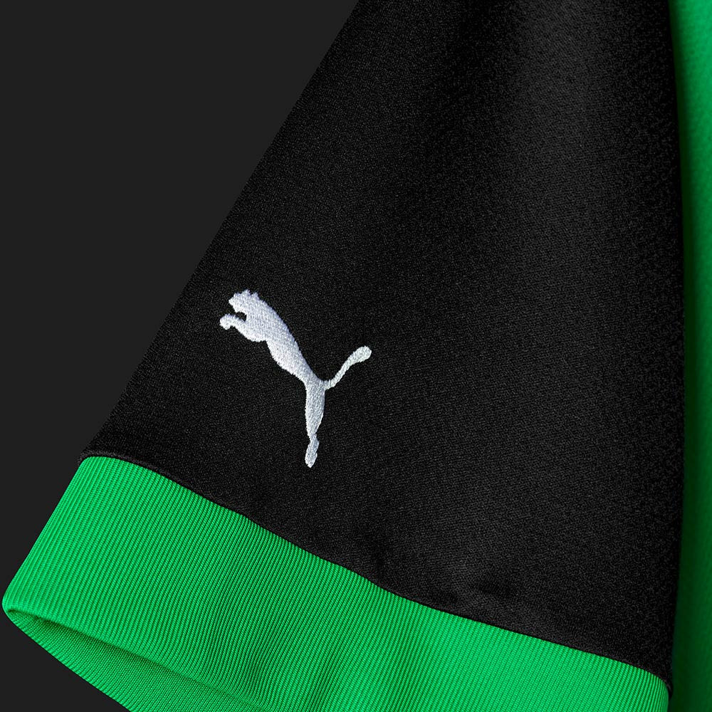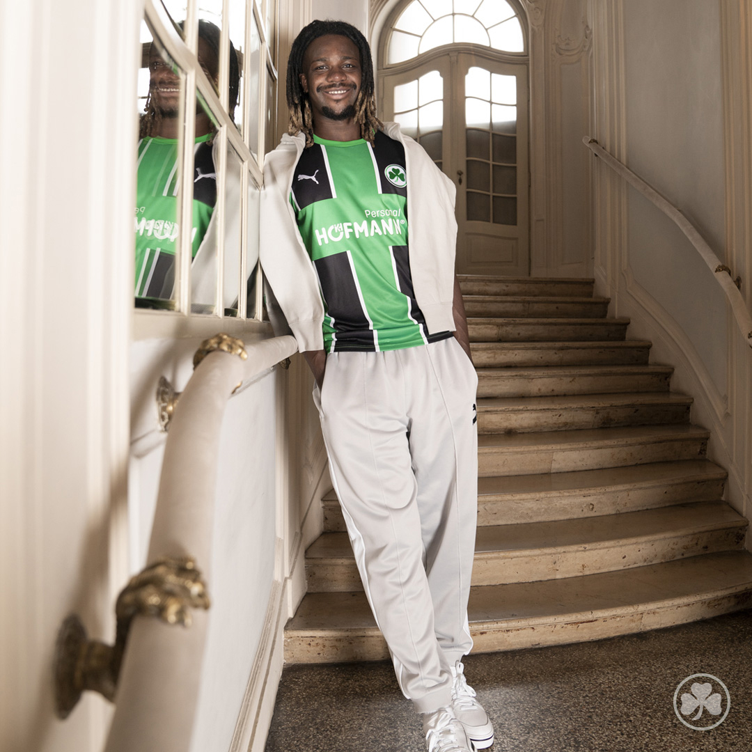 As the German side drops into the 2. Bundesliga for 2022-23, they will have a primary change design featuring a green trunk with white-trimmed black stripes/bars and black sleeves.