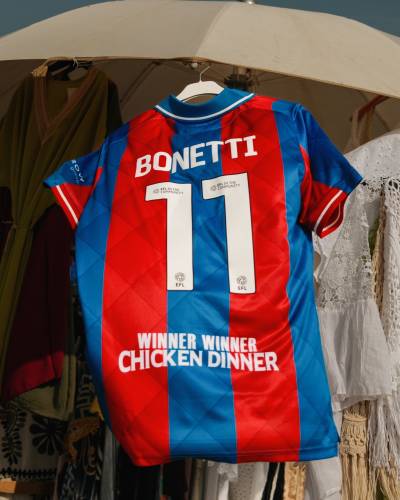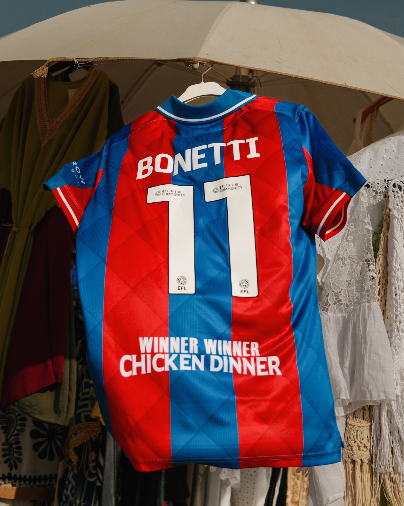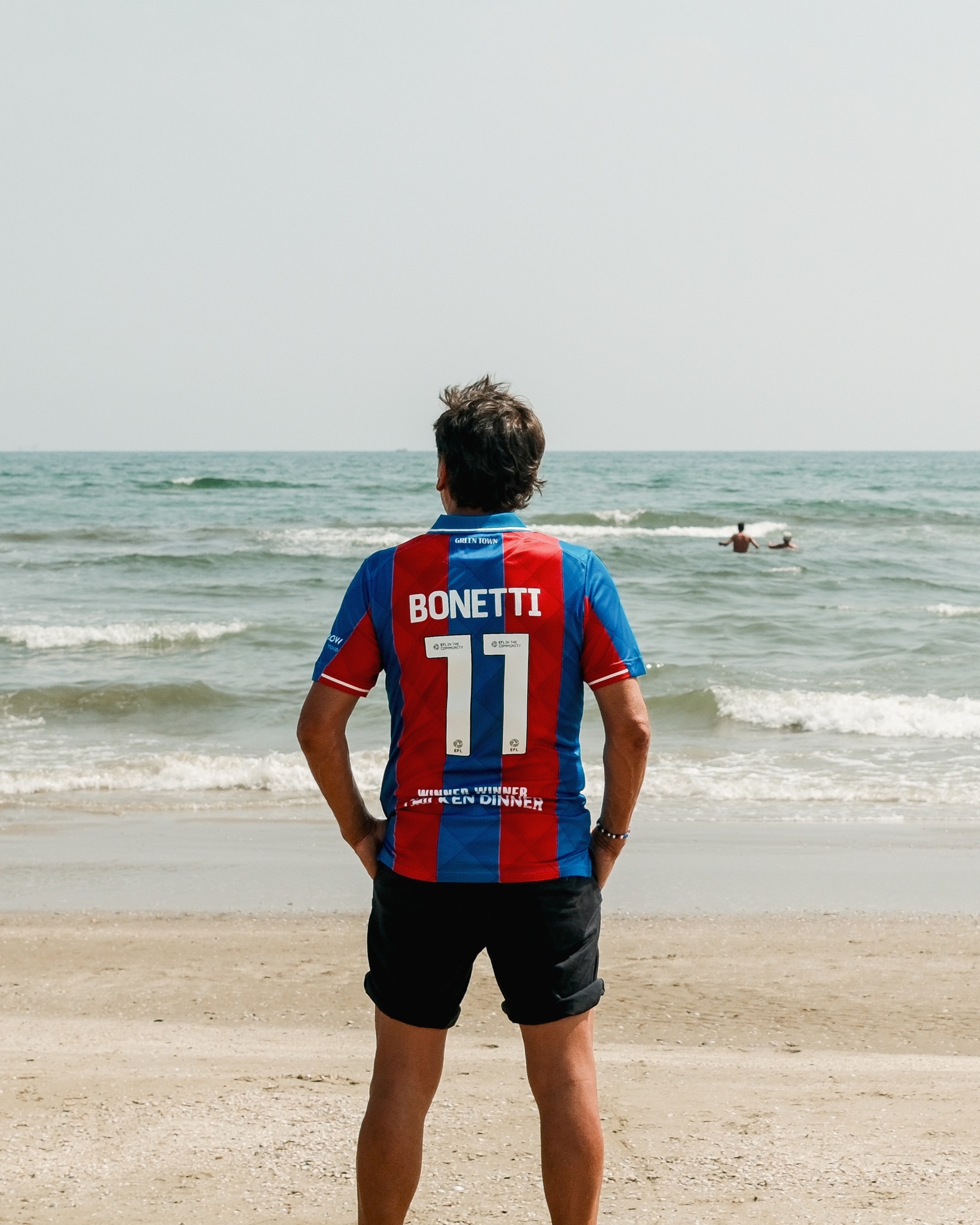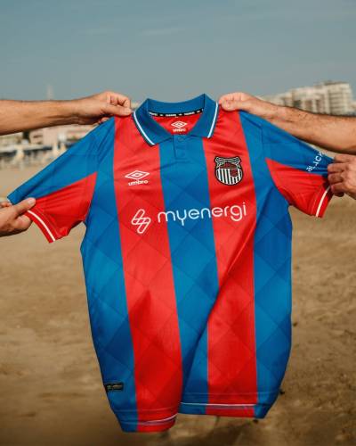 The shirt features wide vertical stripes in red and blue with a subtle diamond pattern, a buttoned fold-over collar with white trim, and the club crest on the chest.