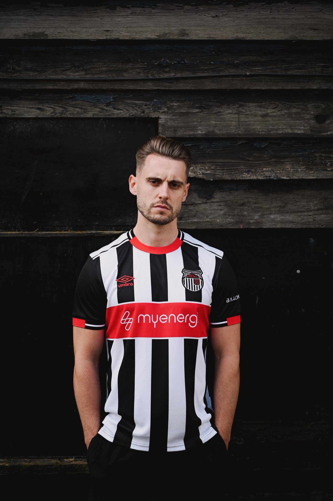 The shirt features classic black and white vertical stripes with a bold red chest band showcasing the myenergi sponsor, accented by red sleeve cuffs and a crew-neck collar. The Umbro logo sits on the right chest opposite the Grimsby Town crest.