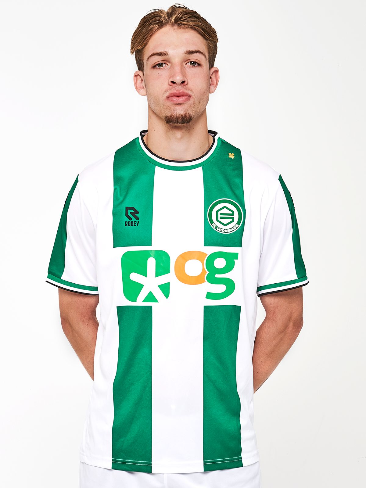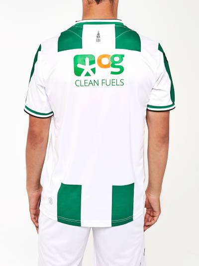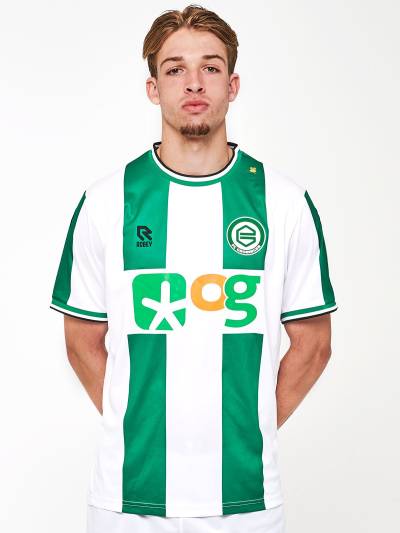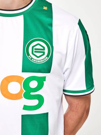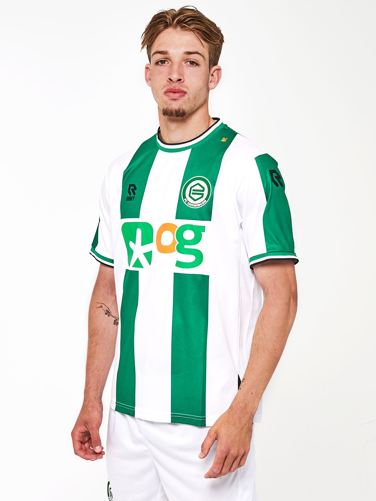 Newly of the Netherlands’ Eerste Divisie after their recent relegation from the Eredivisie, the 2023-24-season Robey release for Groningen features green stripes on a white base, with black used for trim - along with green - the supplier’s logos and the depiction of the city’s “Martinitoren” tower on the upper back.