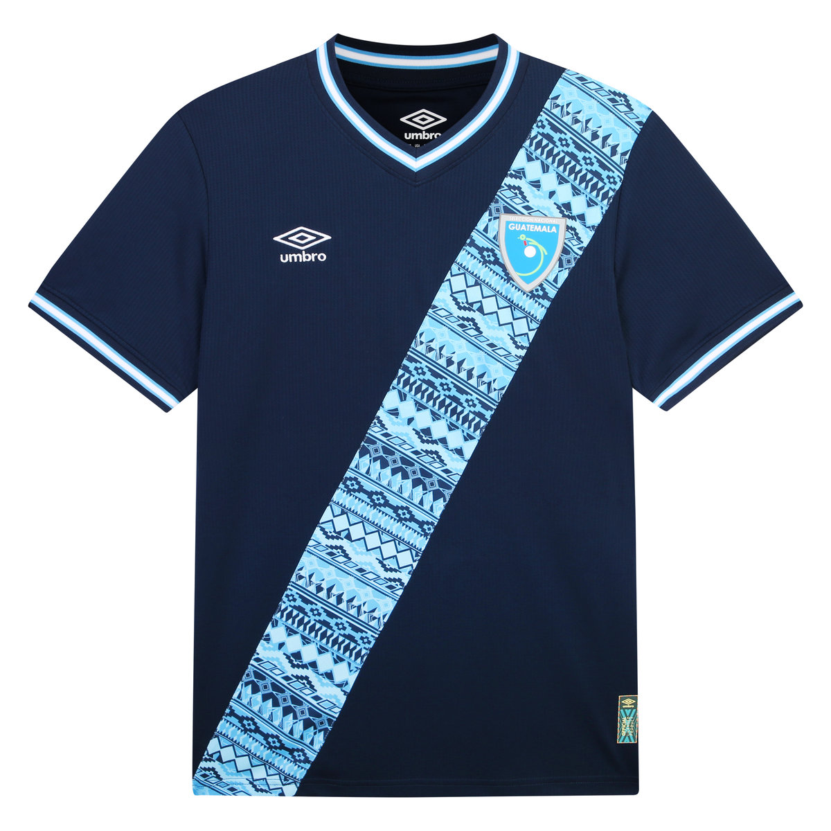 Mayan culture-inspired graphics within the sash mimic the stitching technique used in Huipils. Additional elements include an embroidered double diamond logo, the Guatemalan National Team emblem in full colour, and accents in the hues of the national flag.