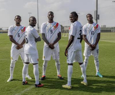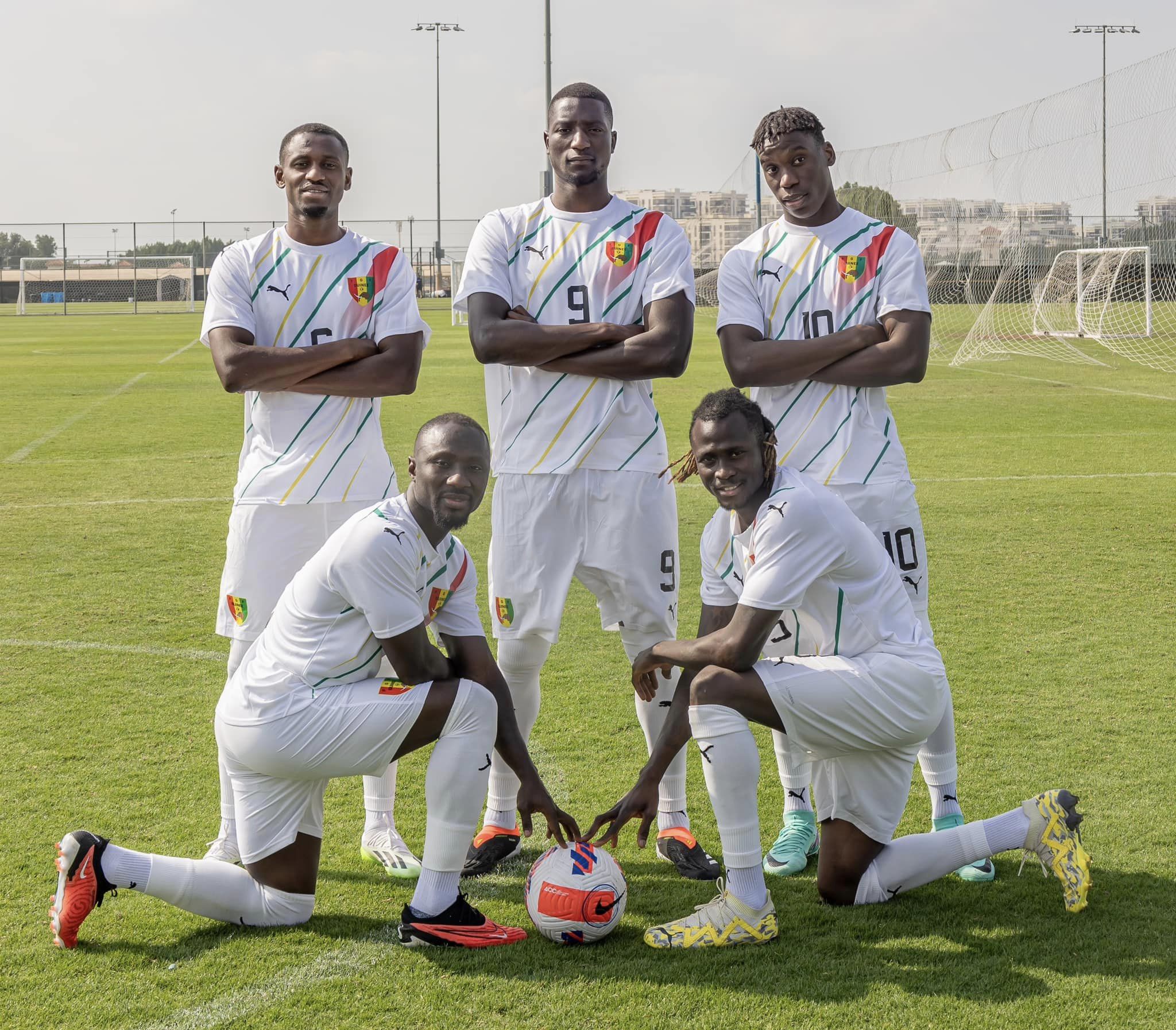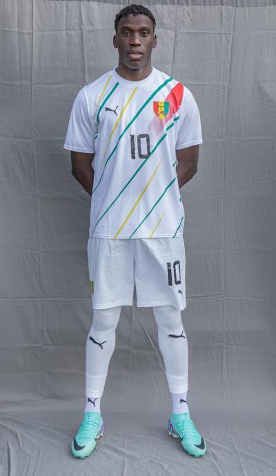 The 2024 secondary release from Puma is in white with a stylised diagonal striping on the trunk that refers to the colours of the national flag (and the Fédération Guinéenne de Football national football association).