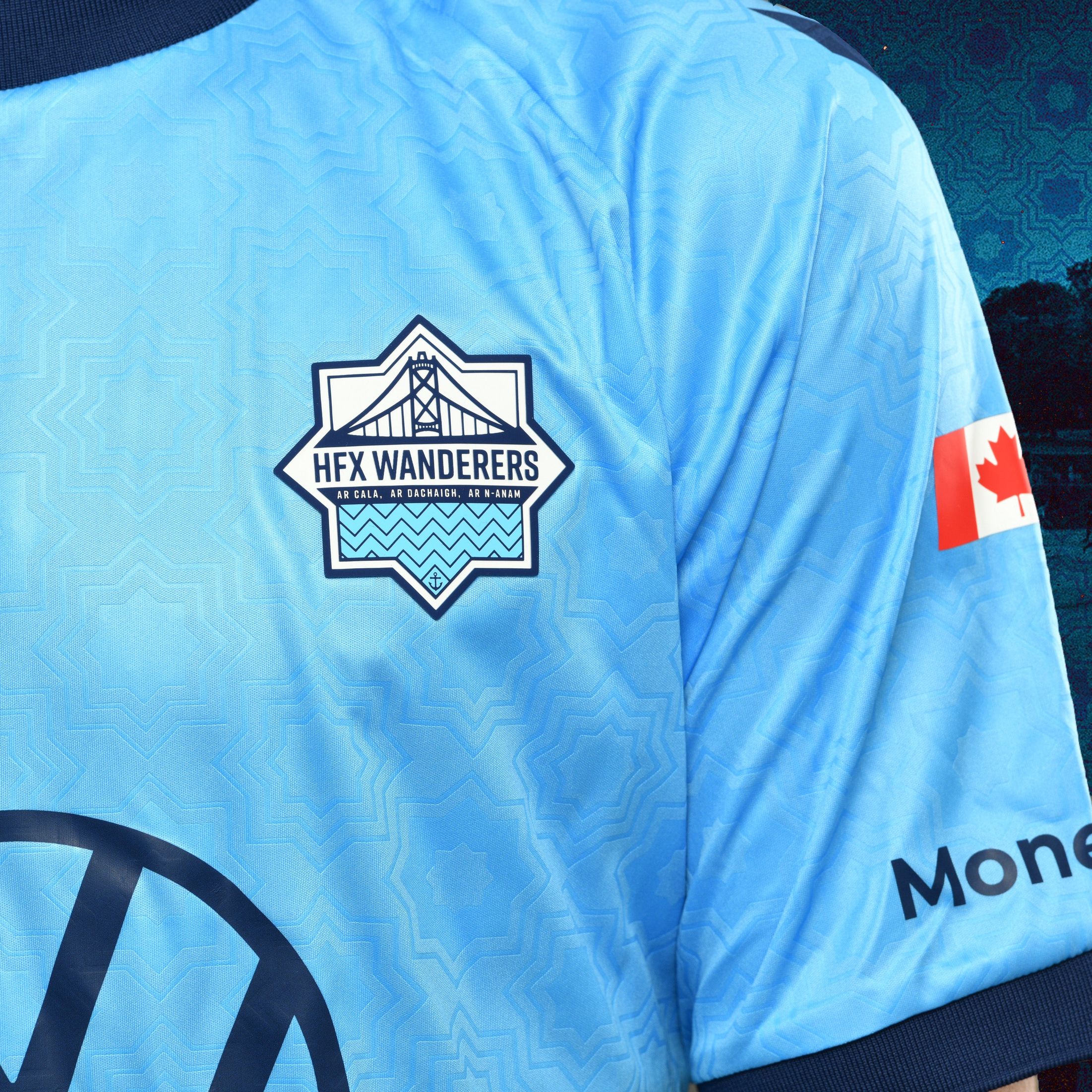 The new Halifax Wanderers jersey is presented in aqua, paired with dark harbour blue accents. A tonal geometric design is integrated across the fabric, featuring repeating citadel shapes that appear subtly within the material and become more visible under changing light conditions. The motif draws inspiration from Halifax Citadel, one of the city’s most recognisable historic landmarks.