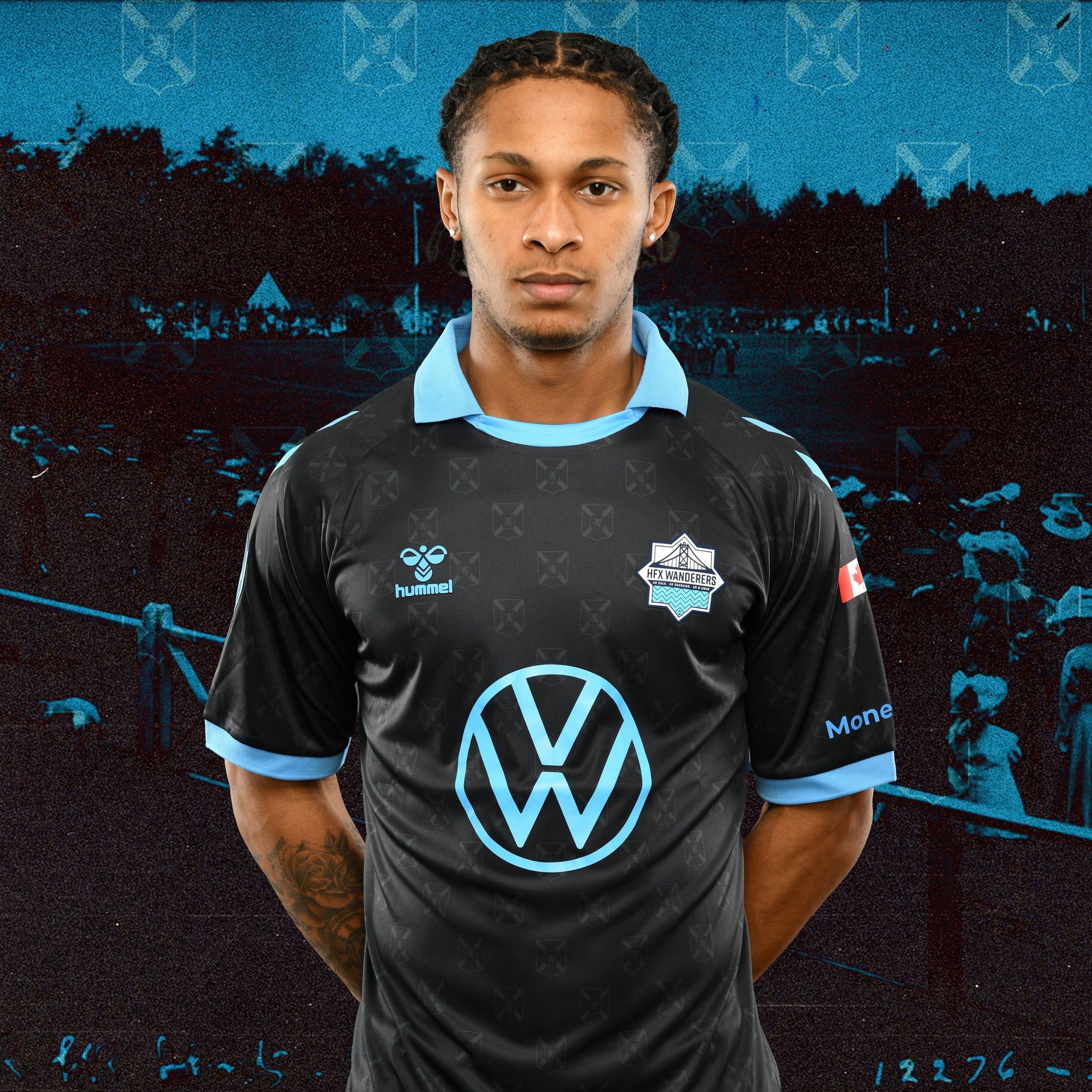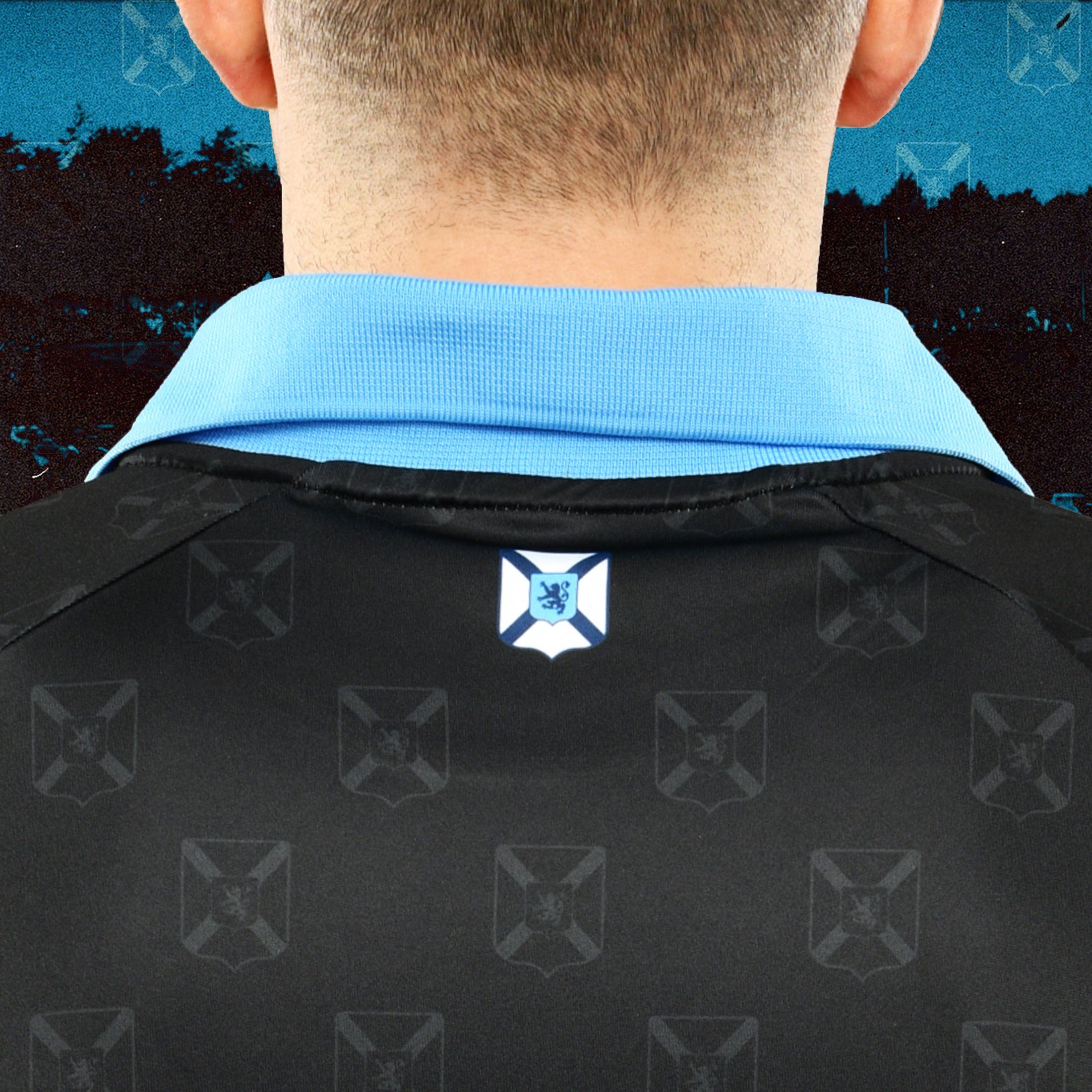 The new Halifax Wanderers jersey features a black base with a repeating tonal pattern made up of the WAAC shield. The symbol incorporates the saltire and rampant lion elements from the flag of Nova Scotia, linking the shirt to the region’s historical identity. These crests are integrated subtly into the fabric to form a repeating motif across the front and sleeves.