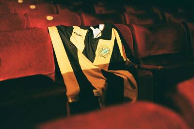 The home shirt is predominantly white with green detailing, ribbed sleeve cuffs, and a retro-inspired collar. The away shirt brings back the striking black and yellow "tiger" colours, a nod to past designs.