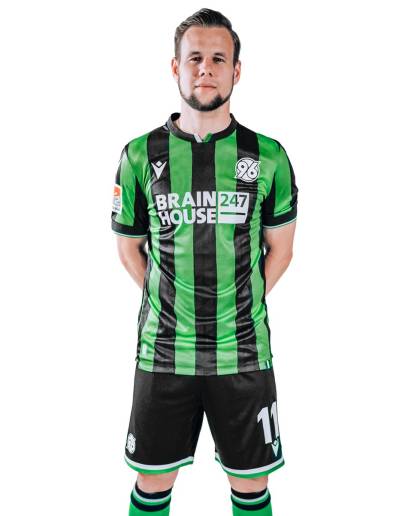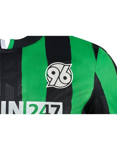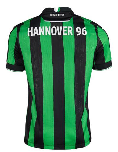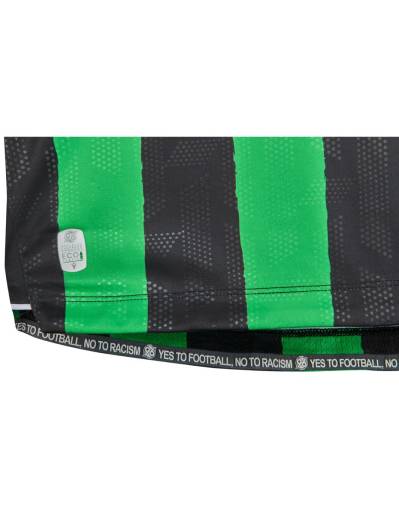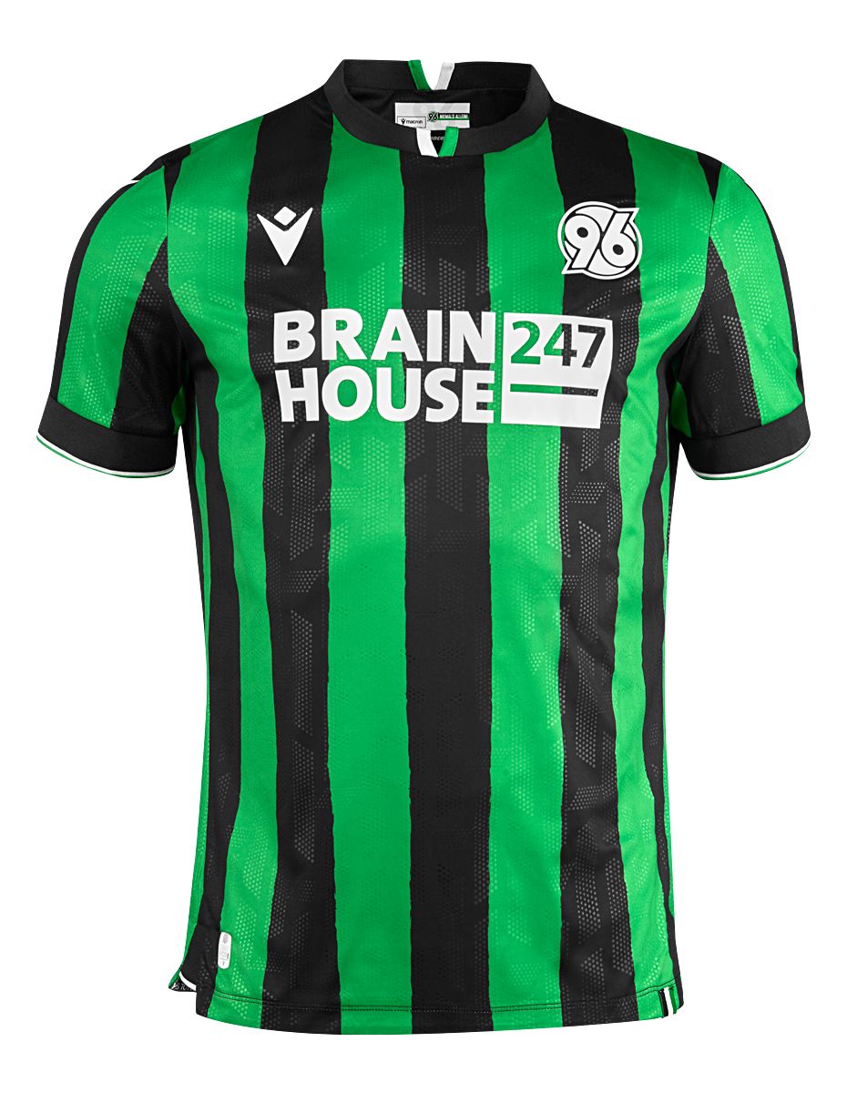 The 2023-24 secondary release for the German 2. Bundesliga side features classic green and black stripes with background patterning, while commercial branding and identifying elements - including the club crest - contrast in white.