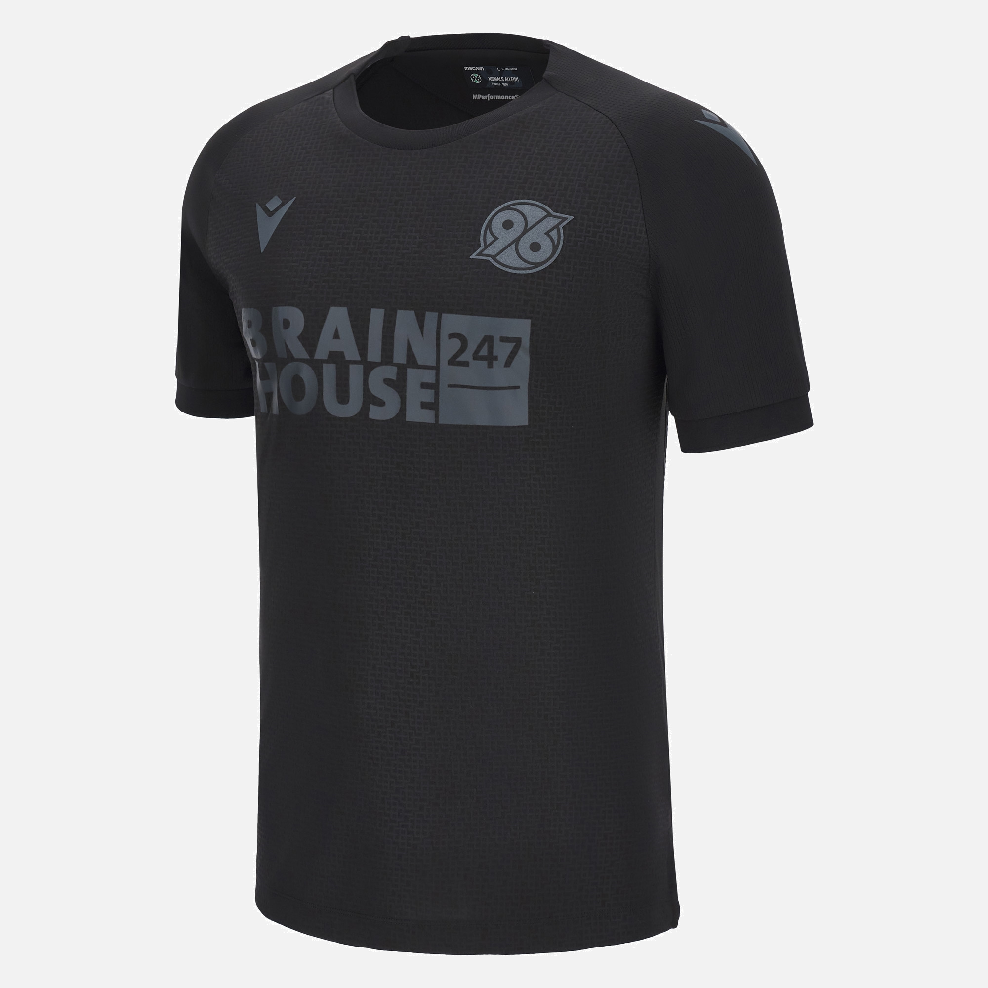 The jersey features the Macron logo, along with the logos of Hannover 96, main sponsor Brainhouse 247, sleeve sponsor Travnik, and the Bundesliga, all in black.