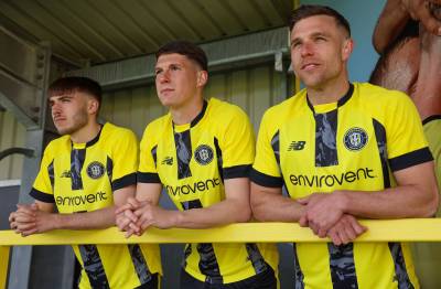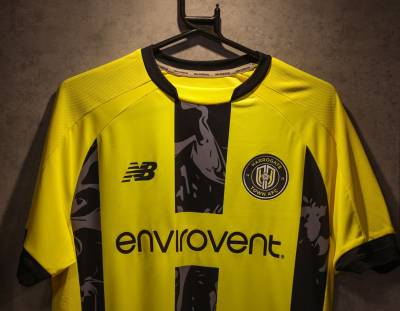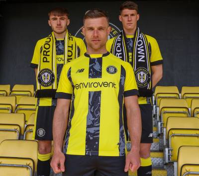 The 2024-25-season “NB” primary release for the English EFL League Two side features black-and-grey visually textured stripes applied to a yellow base, with the crest in full colour and the neck in cuffs in black too.