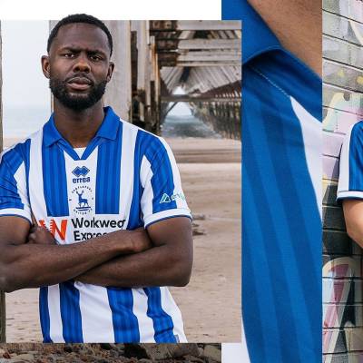 The Away shirt showcases a sky-blue design, incorporating a map of Hartlepool and paying homage to the club’s old “ship’s wheel” logo. This design symbolises taking Hartlepool wherever the team travels.