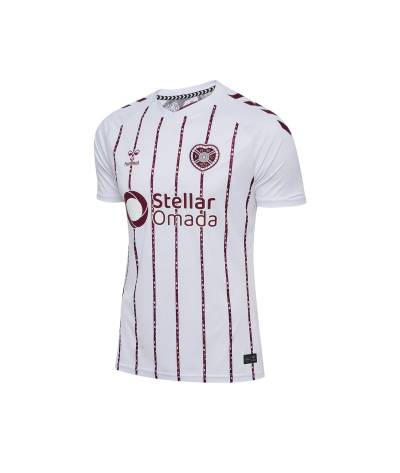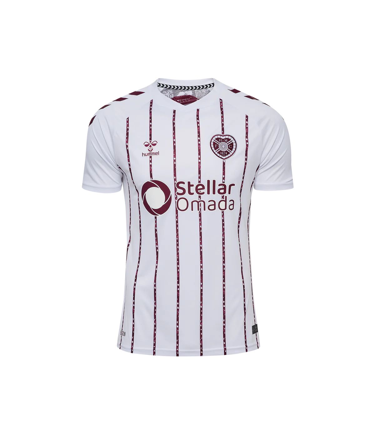 The shirt is white with vertical maroon pinstripes, each featuring a repeating pattern based on the club crest design seen on the seats of Tynecastle Park. The Hummel chevrons run across the shoulders in maroon, with the Hummel logo and front-of-shirt sponsor Stellar Omada also appearing in maroon.