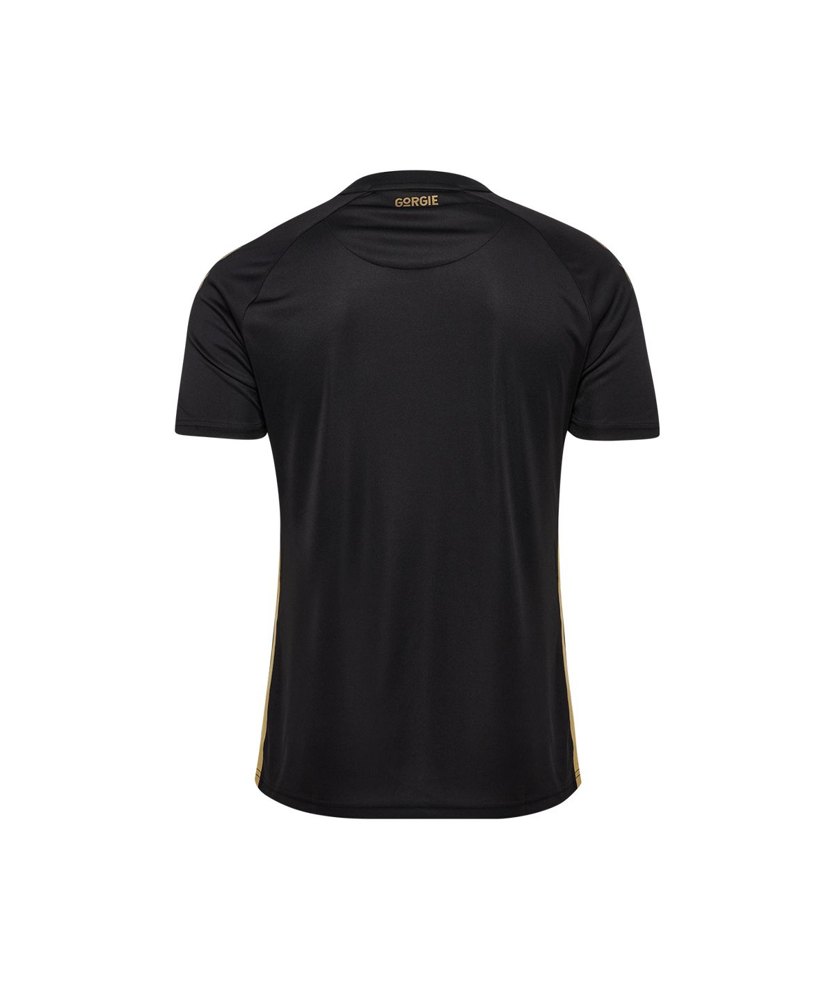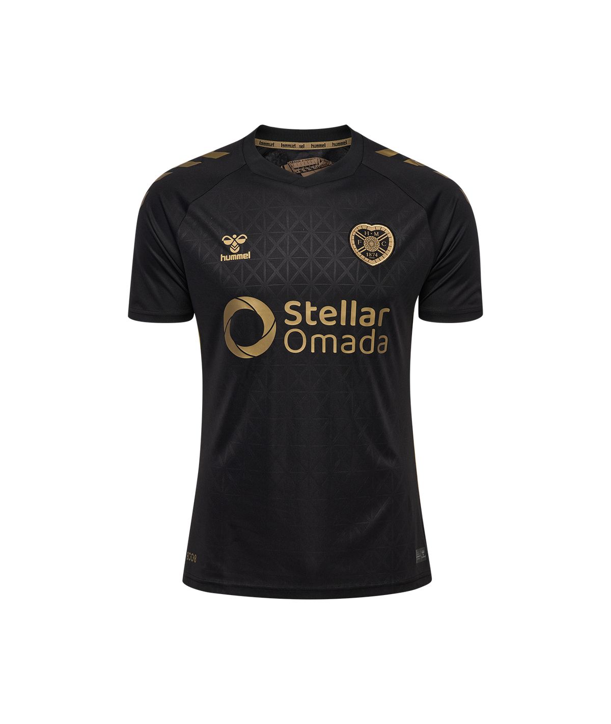 The shirt comes in black with gold accents, including the club crest, Hummel logo and sponsor Stellar Omada.