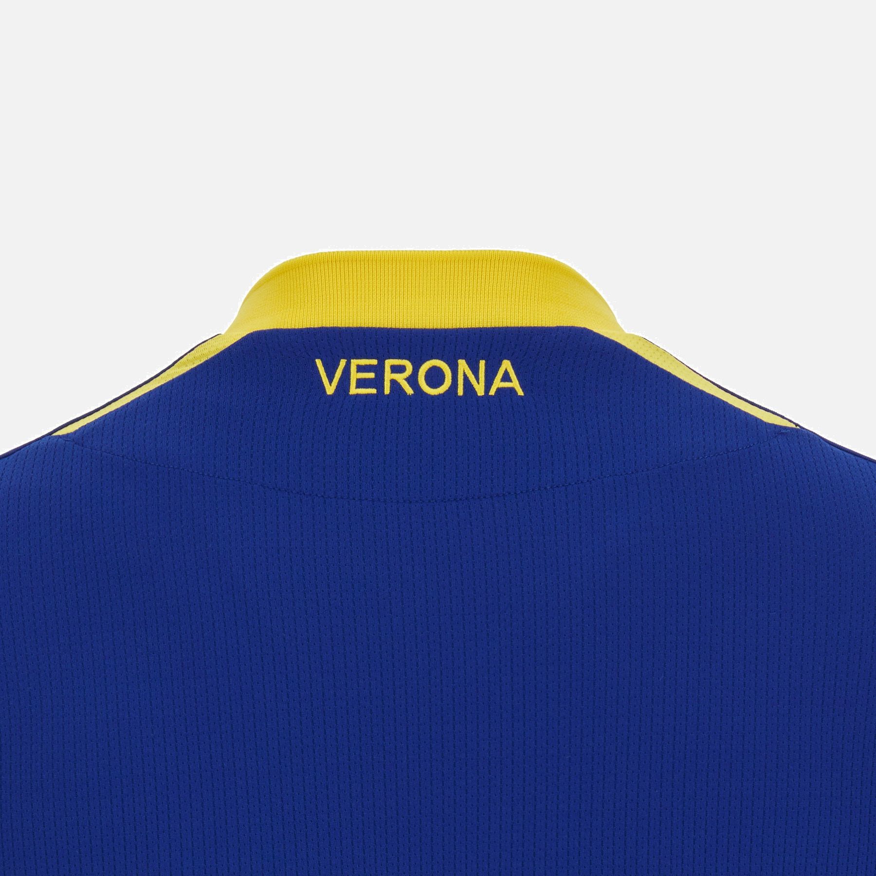 As for the colours, Verona blue is dominant in the jersey, with a knitted V-neck bordered in Verona yellow. The same chromatic note is also present on the sleeve edges. The backneck is personalised with the club's colours and its founding year, 1903, whose 120th anniversary will be celebrated during the new season. On the backneck, the word VERONA is embroidered in yellow. On the right side of the chest is embroidered the Macron Hero, logo of the Italian brand, whereas on the left, heart-side, the club's logo, which was renewed two years ago and distinguished by the two mastiffs joined at the ladder.