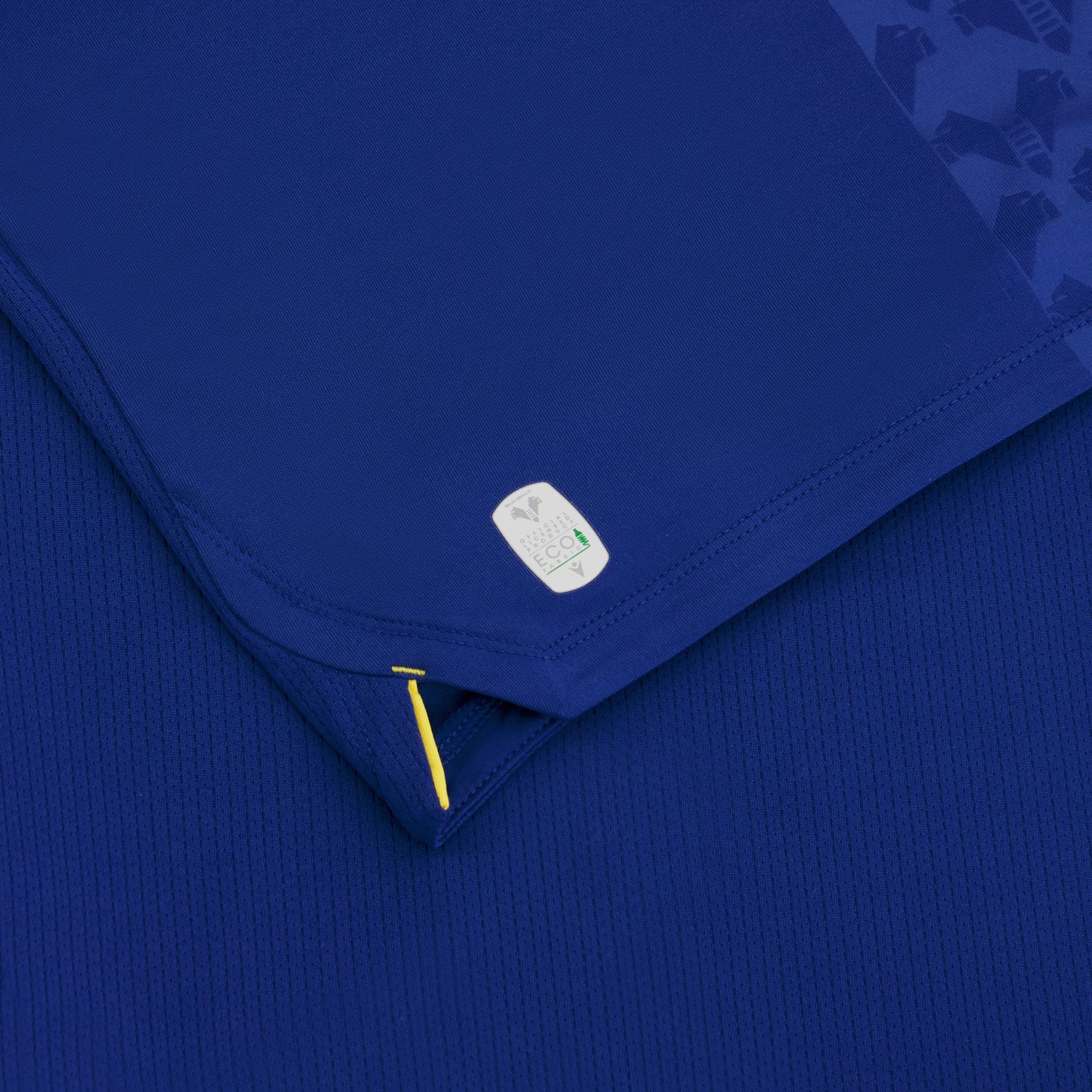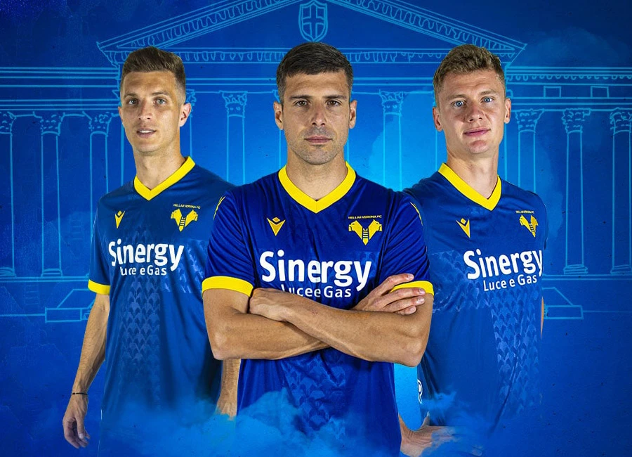 It was precisely to underline this bond with the city that the major novelty of the new Home Kit is a large cross that dominates the entire front of the jersey, recalling the Verona city crest, dating back to the 13th century: a gold cross on a blue background. On this jersey, the cross is represented by the two mighty mastiffs of the club's logo, here proposed in repeated embossed graphics and tone on tone.