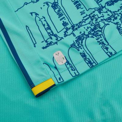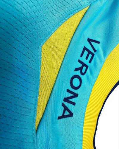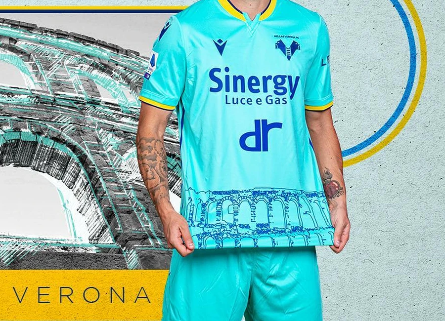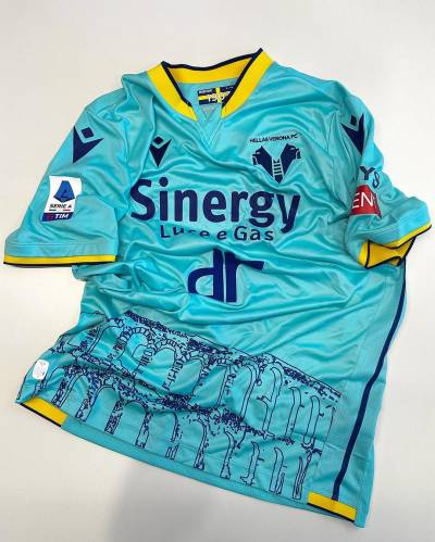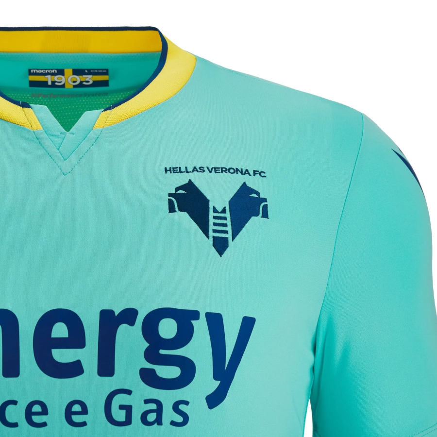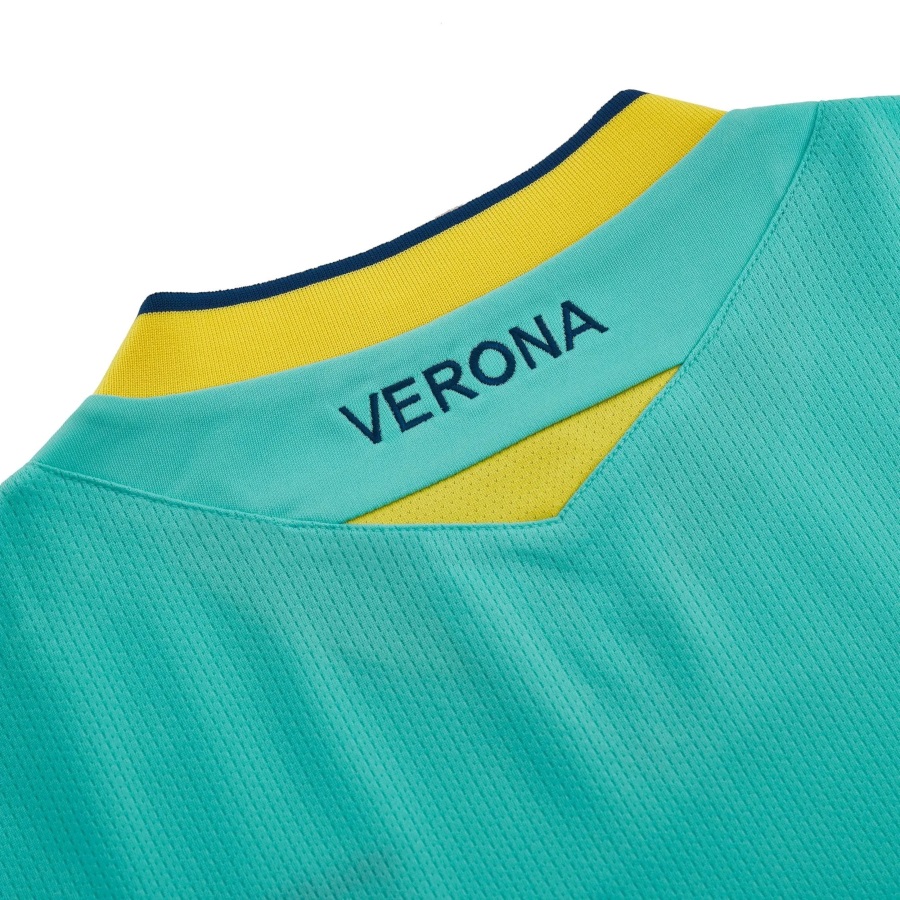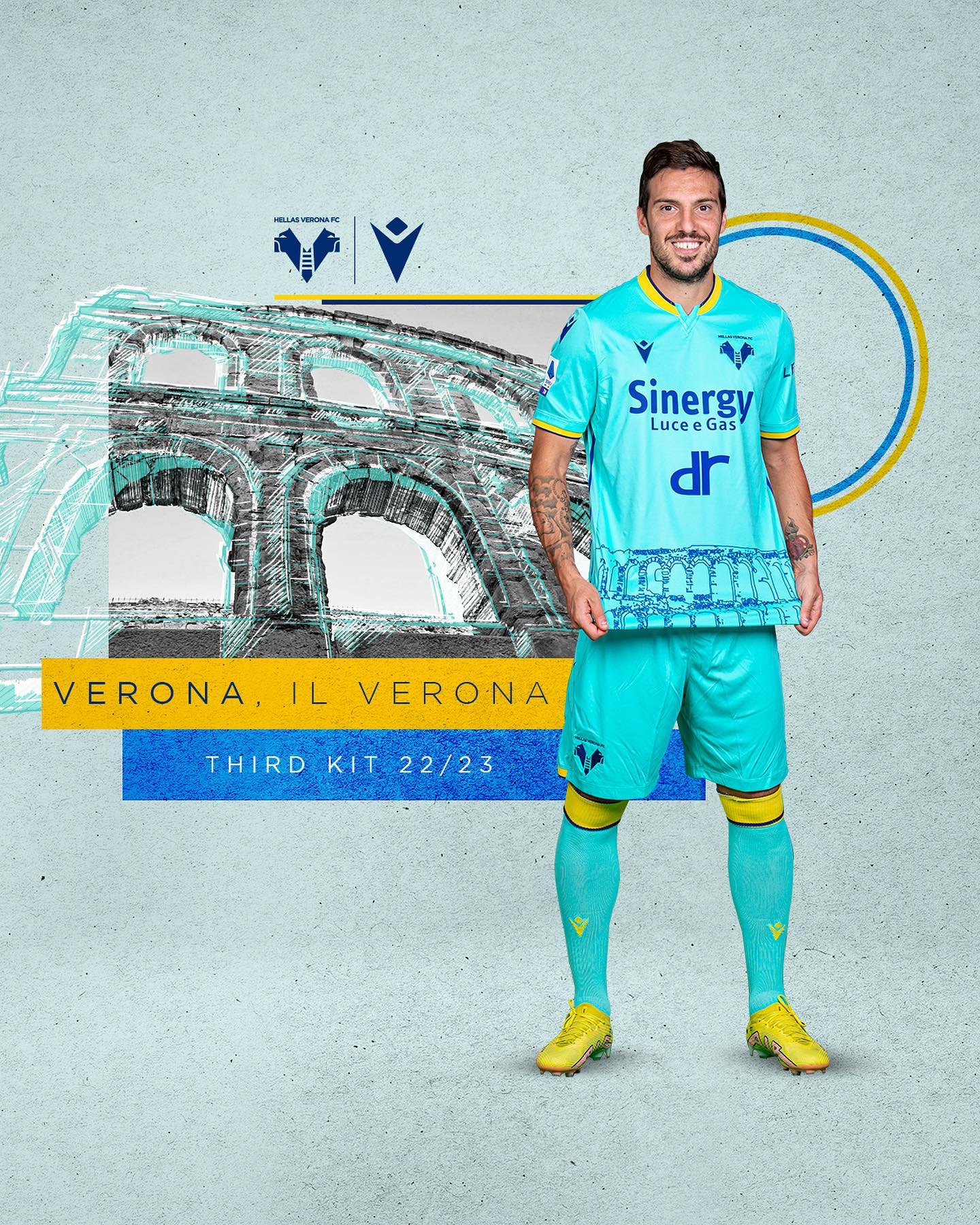 The 2022-23 Macron secondary-change design is in a turquoise tone with yellow-and-deep-blue embellishment, including, in the lattermost tone, as well as the crest, a representation of the club’s home city’s famous Arena di Verona.