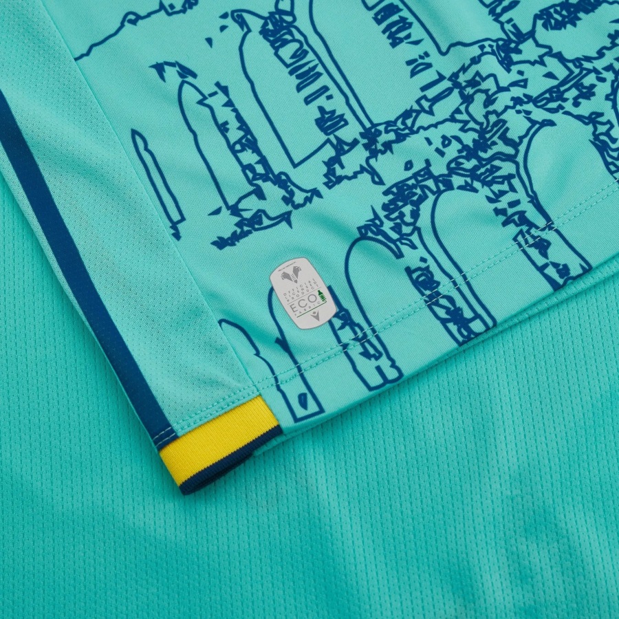 To complete the kit, the Eco-Fabric-incorporating, sustainability-focussed shirt is combined with turquoise shorts and socks in order to form a nominally single-coloured look.