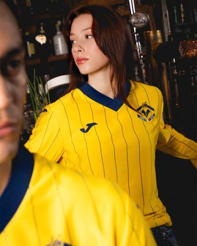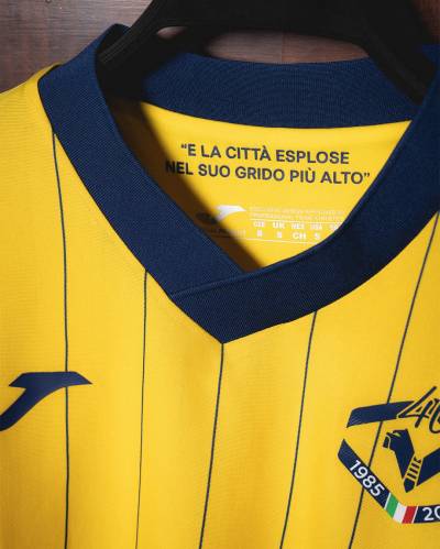 The kit features a yellow base with thin blue pinstripes, matching the colour scheme of the title-winning strip. It includes the club crest featuring the mastiff heads and the number “40” to commemorate the anniversary, with “1985–2025” and the Italian flag displayed below. The Joma logo is positioned on the right chest, and a tricolour flag is placed on the upper back. Inside the collar is a patch with a tribute to Roberto Puliero, bearing the words: “E LA CITTÀ ESPLOSE NEL SUO GRIDO PIÙ ALTO” (And the city exploded in its loudest shout).
