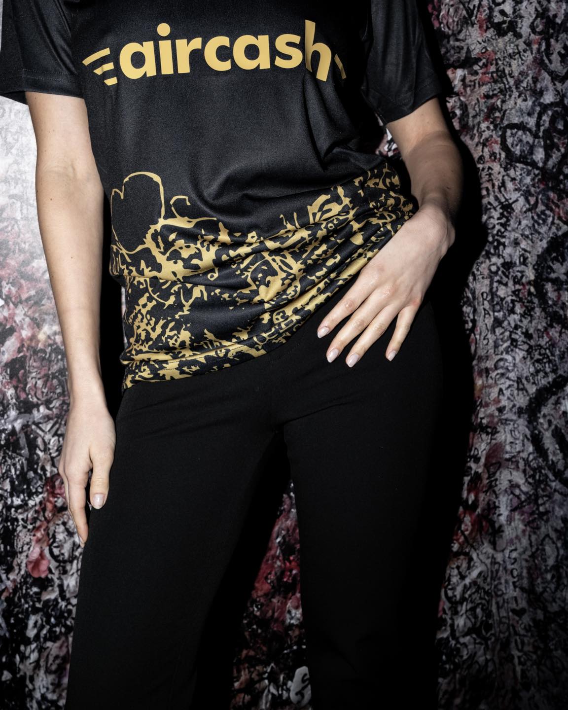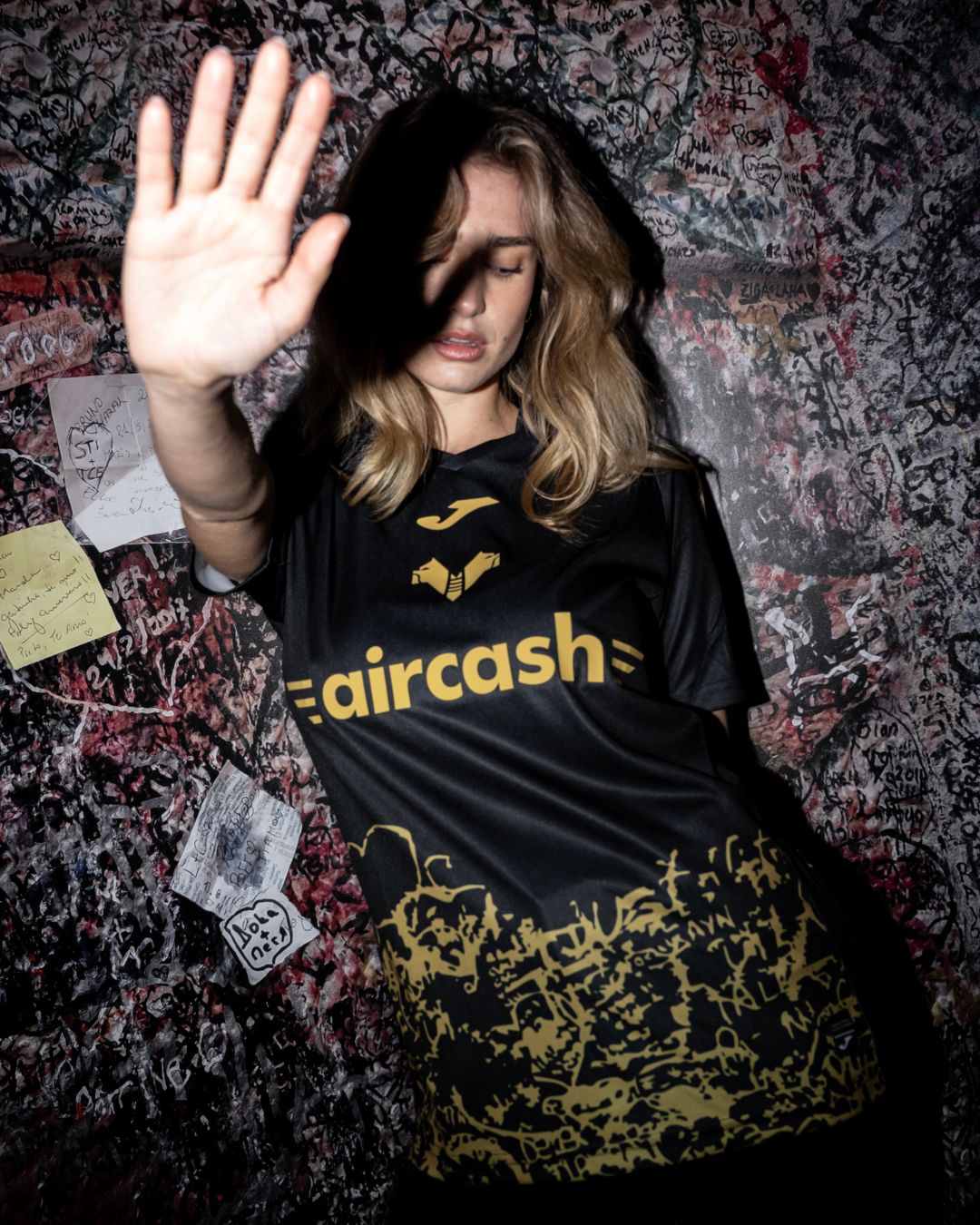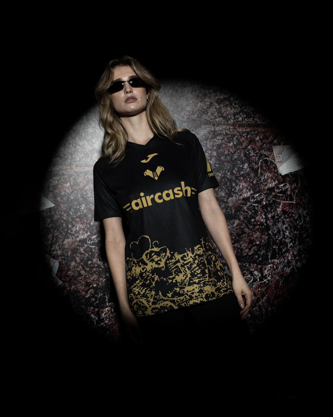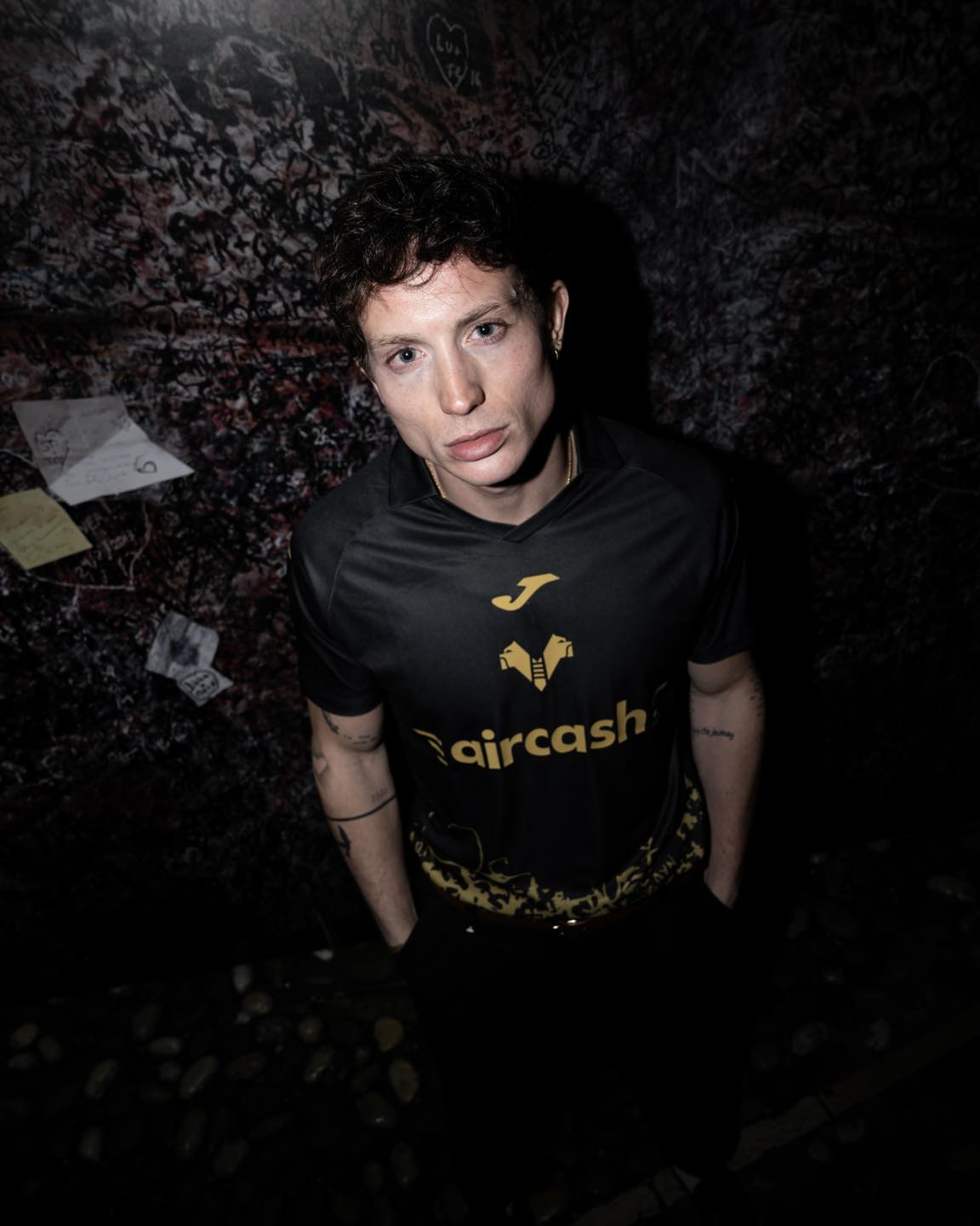 The new Hellas Verona jersey is black with gold detailing across the chest and lower body. A dense graphic runs along the base of the shirt, inspired by the handwritten messages left by visitors at the entrance to Juliet’s House. The gold execution extends to the Joma logo, Hellas Verona crest and main shirt sponsor aircash, while additional sponsor branding appears on the sleeves and reverse.