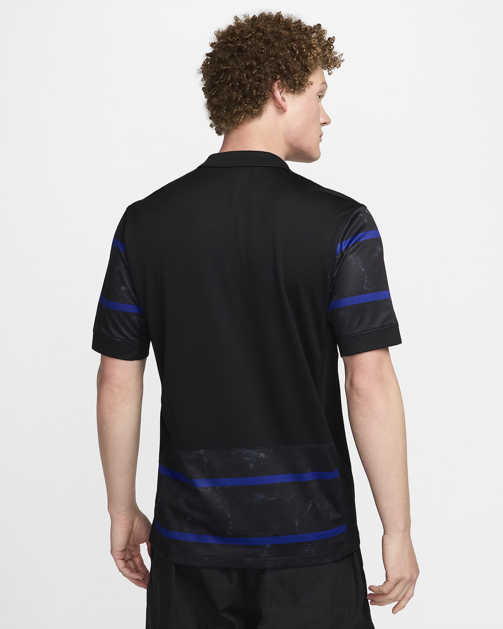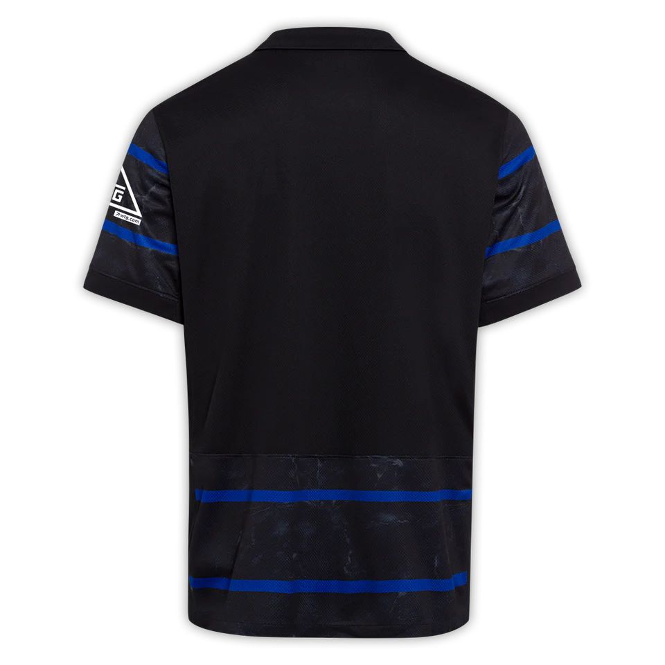 The crest is in full colour, partner/sponsor logos are in white and the kit is completed with black shorts and complementing socks.