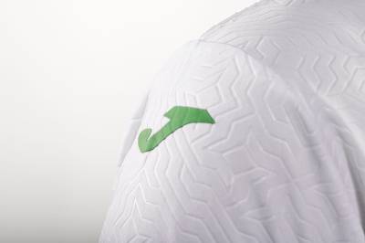 The kit features bespoke details, including an embossed pattern on the white jersey. The green Joma logo is printed on the left chest, while the Hibernian FC badge is embroidered on the right.