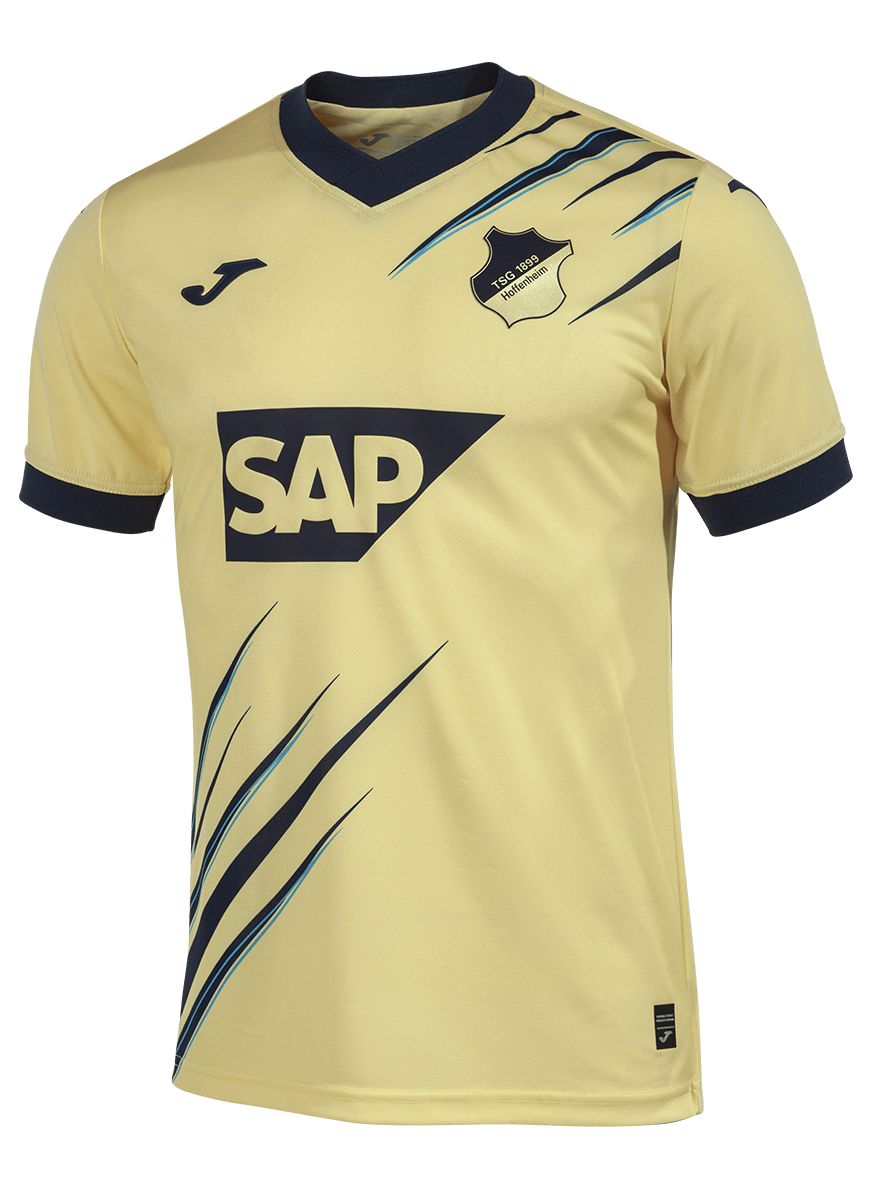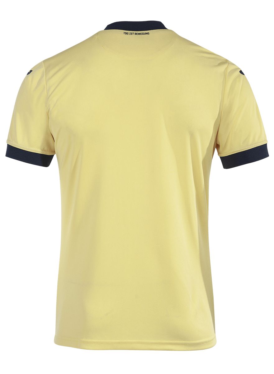 The colour-converted crest is in keeping with the shirt palette - contrasting, as it does, the yellow base with navy V-neck and cuffs - and the same can be said of all the partner logos and the “TSG IST BEWEGUNG” (TSG is movement) print on the upper back. The kit is completed with navy shorts and yellow socks.