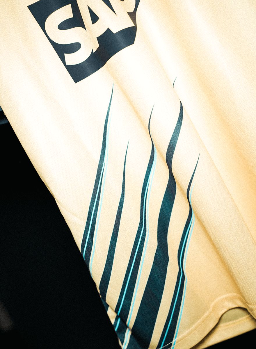 Based on a design Die Kraichgauer wore as an amateur side in the 1990s, the new secondary release from Joma is in a pale yellow tone with navy-and-light-blue graphical embellishment.