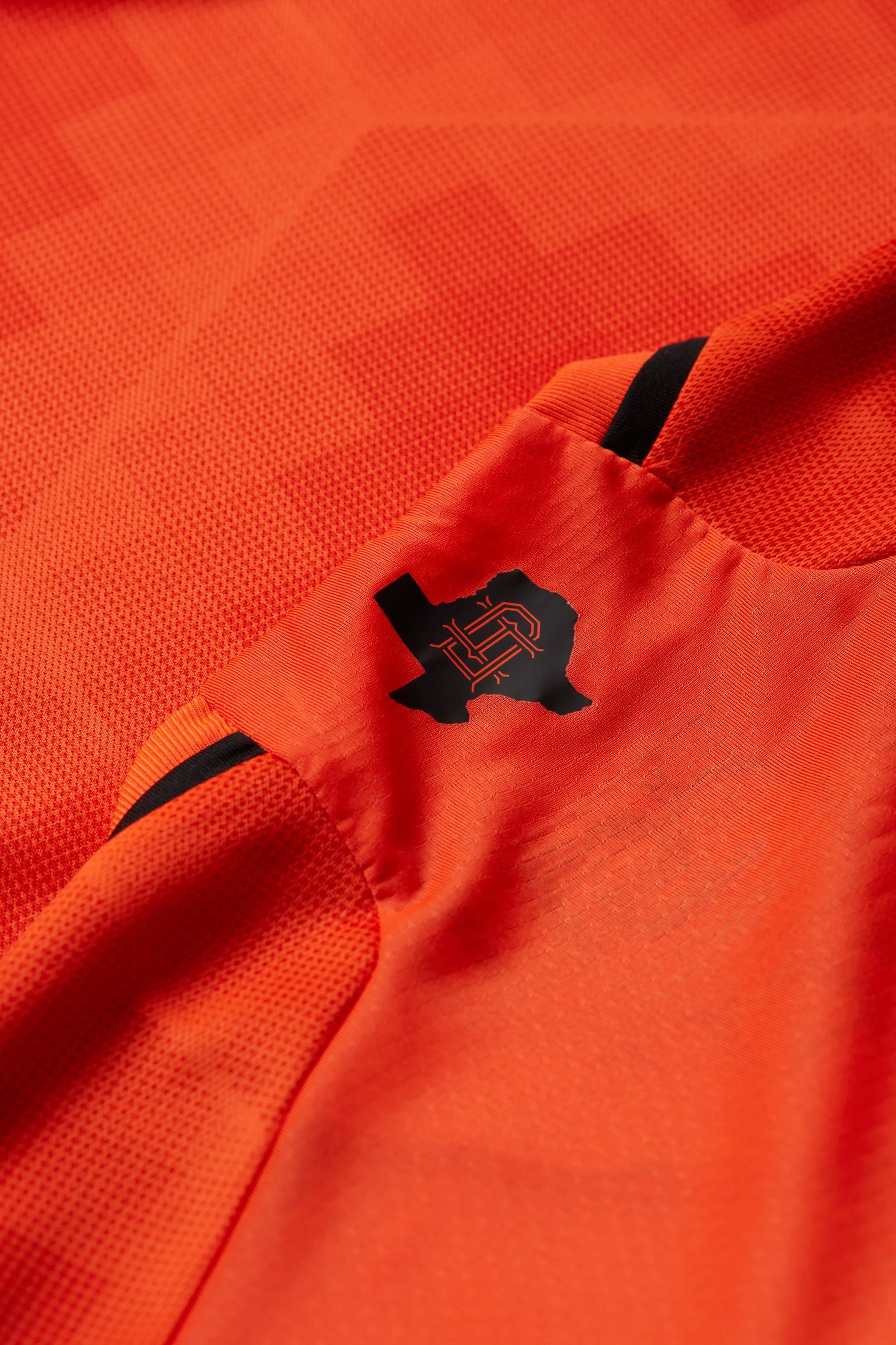 El Sol pays homage to the Sun's energy, light, and guidance, but with a distinct Texas flair. The radiant kit signifies a new era in the history of the two-time MLS Cup champions, featuring an array of orange tones. The graphics on the front of the shirt take inspiration from the hexagonal shape of the team's logo, creating a bold visual impact.
