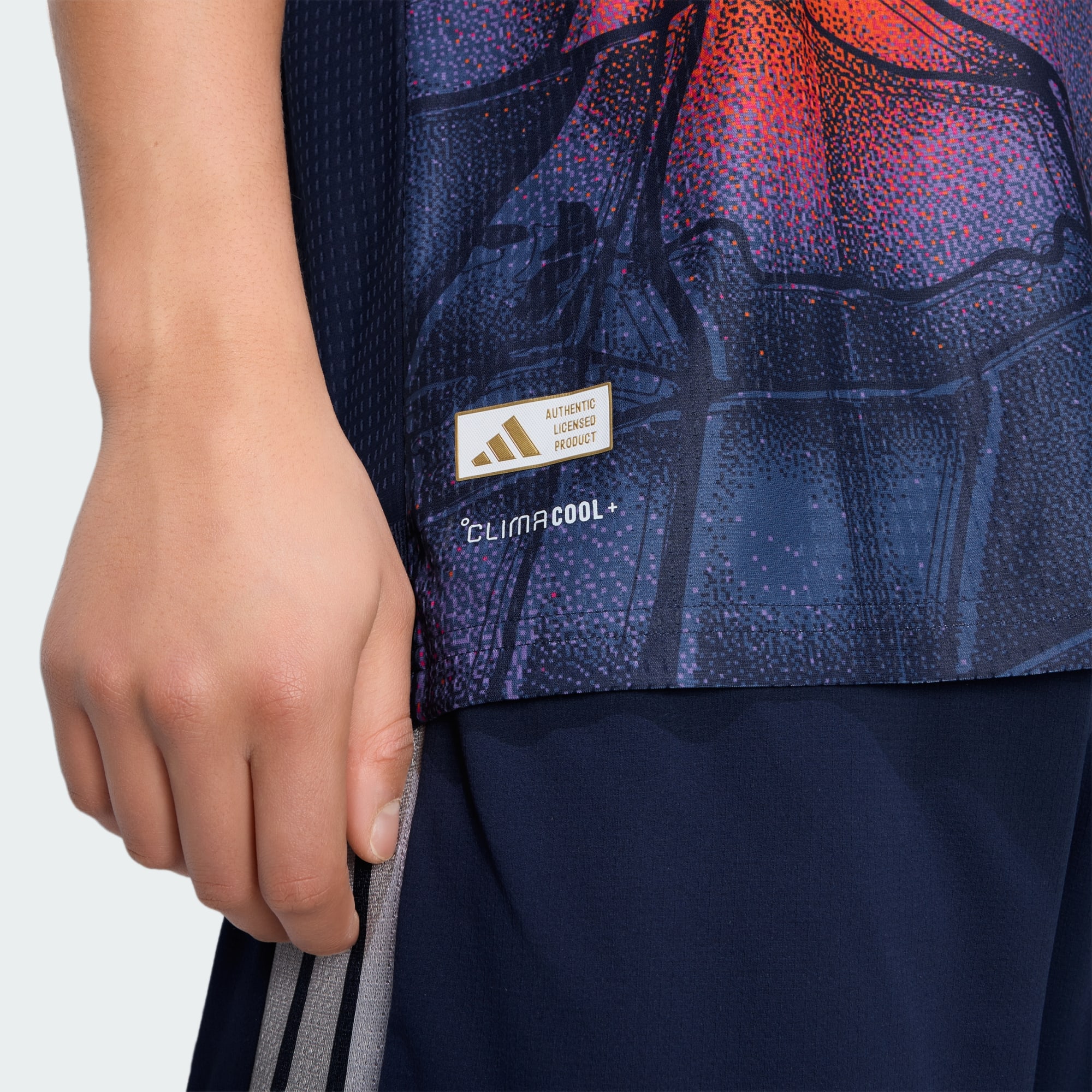 The new Houston Dynamo jersey combines Night Indigo with Vivid Orange and Purple graphic detailing across the front and sleeves. The all over print presents a satellite style view of the city, overlaid with a heat map effect that runs diagonally across the torso. A lightning bolt graphic is integrated within the pattern to reference the location of Shell Energy Stadium.