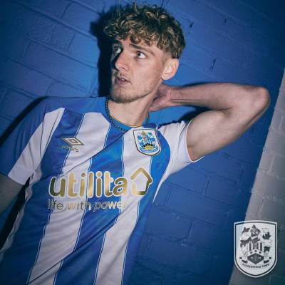 The new Huddersfield Town 2023/24 Umbro home kit pays homage to the club's historic achievement as the 1923/24 Champions of England. The kit features several design elements that celebrate this milestone, including the inscription "Huddersfield Town AFC 1923/24 Champions of England" inside the neckline. The kit also showcases gold detailing around the neck, collar, and Umbro's double diamond logo. The club crest, embroidered, is enveloped in gold, adding a touch of prestige to the overall design.