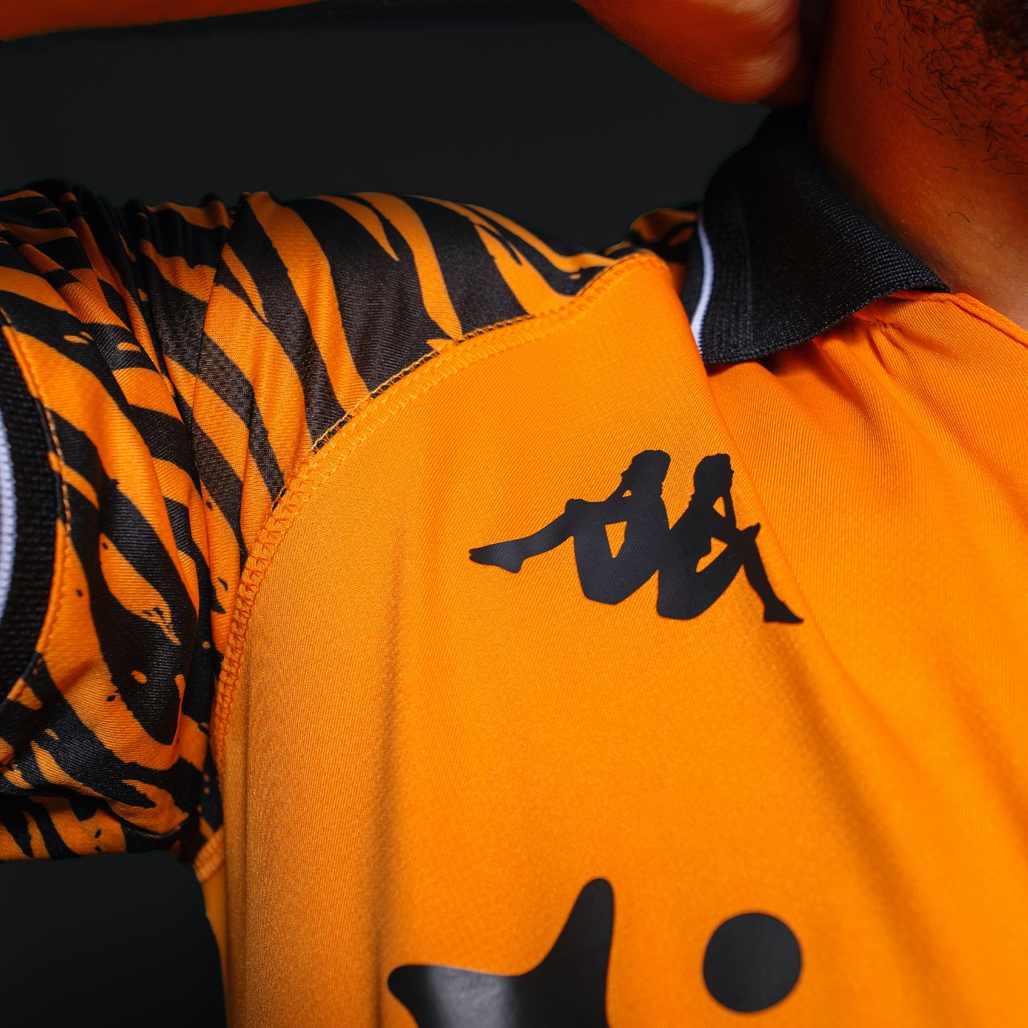 The shirt features an all-amber front and back, paired with distinctive black and amber tiger print sleeves that reference the club’s early 1990s jerseys. Kappa’s Omini logo appears in black on the chest and in white on both shoulders.