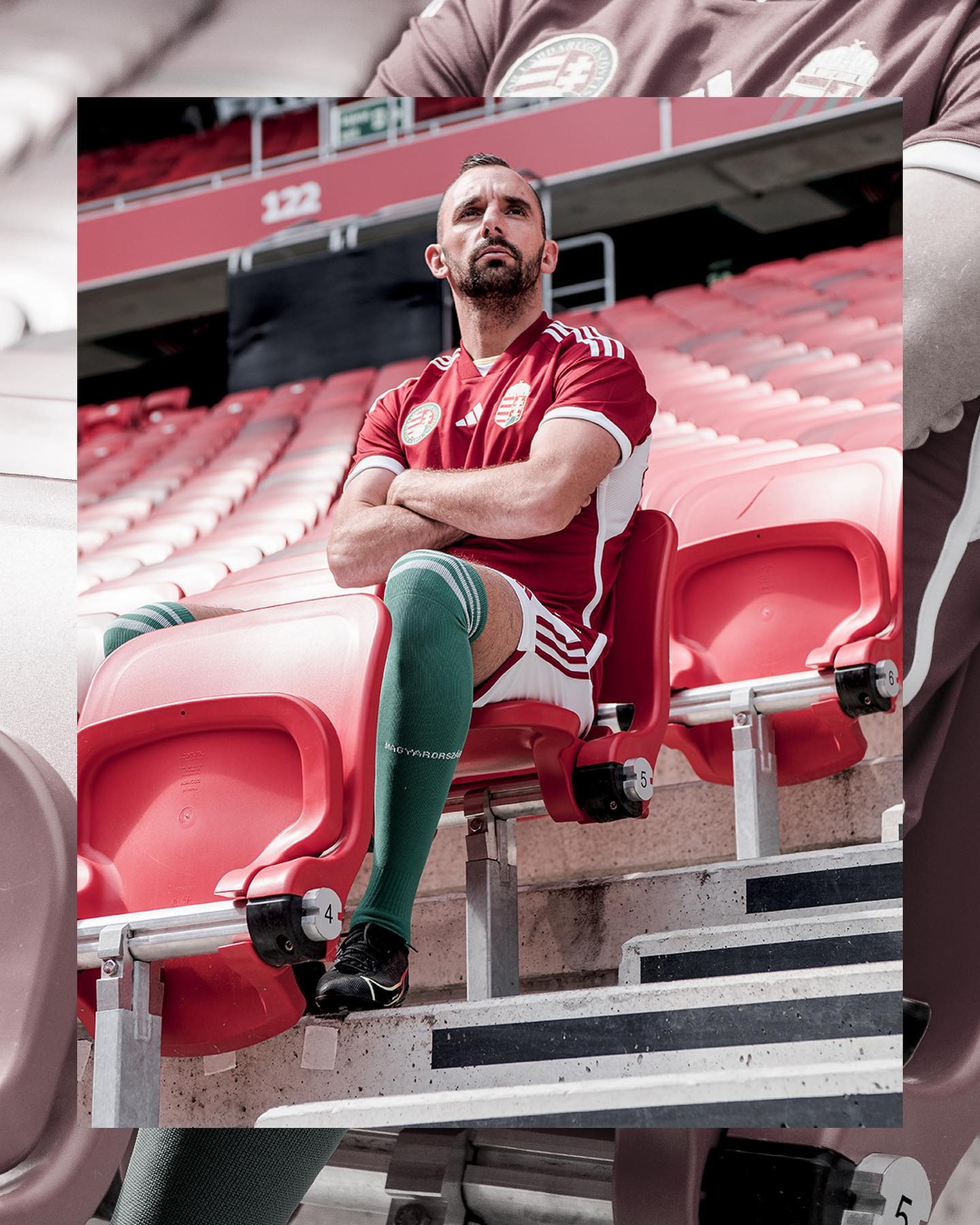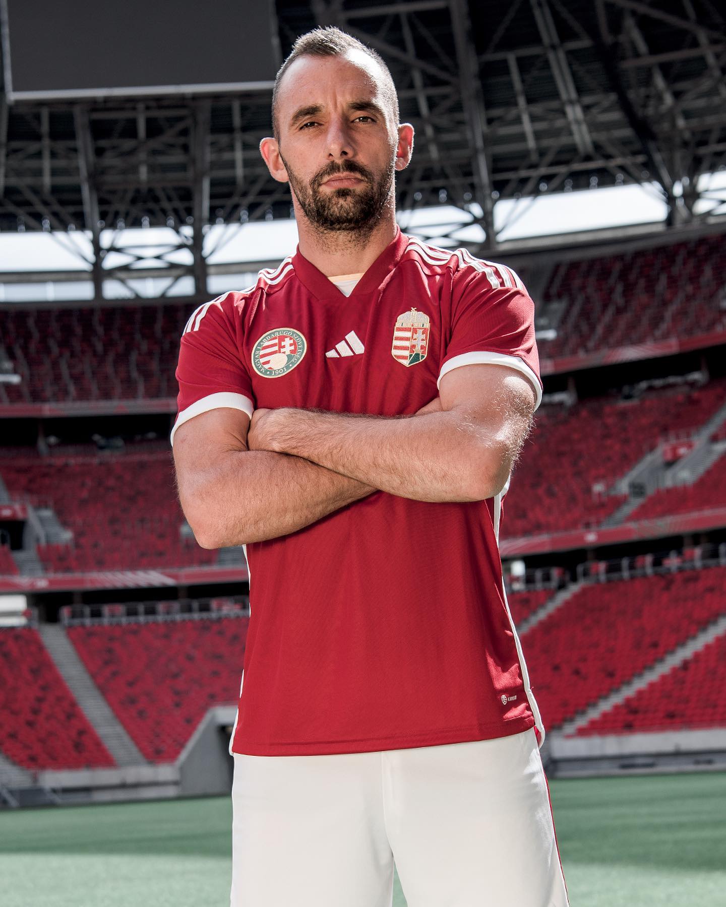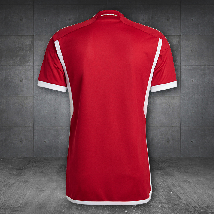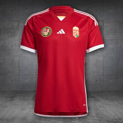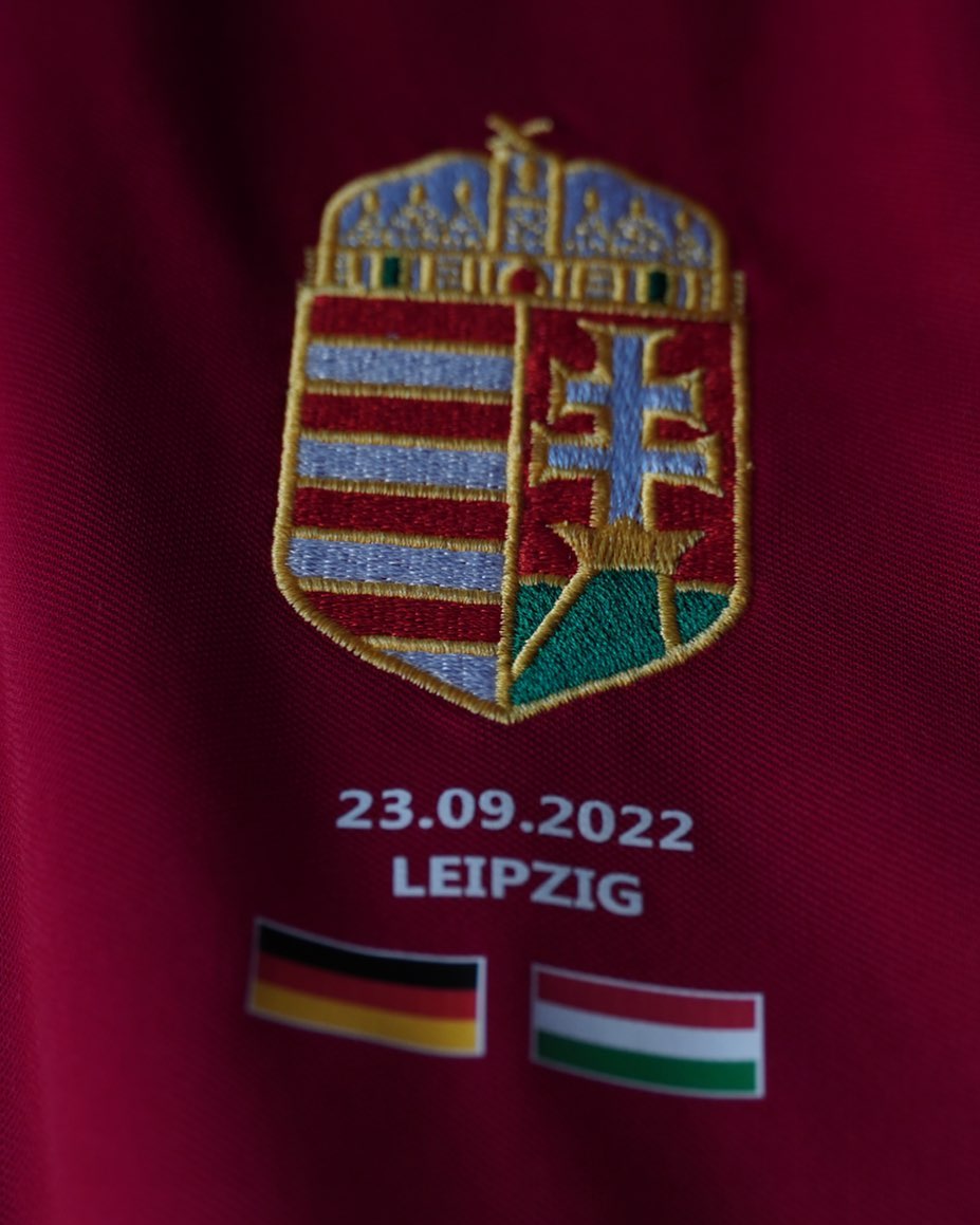 The cuffs and the backing to the V-styled neck are also in white, with the latter also boasting a golden detail that ties in with the two chest logos - the coat of arms and the Magyar Labdarúgó Szövetség (Hungarian FA) emblem.
