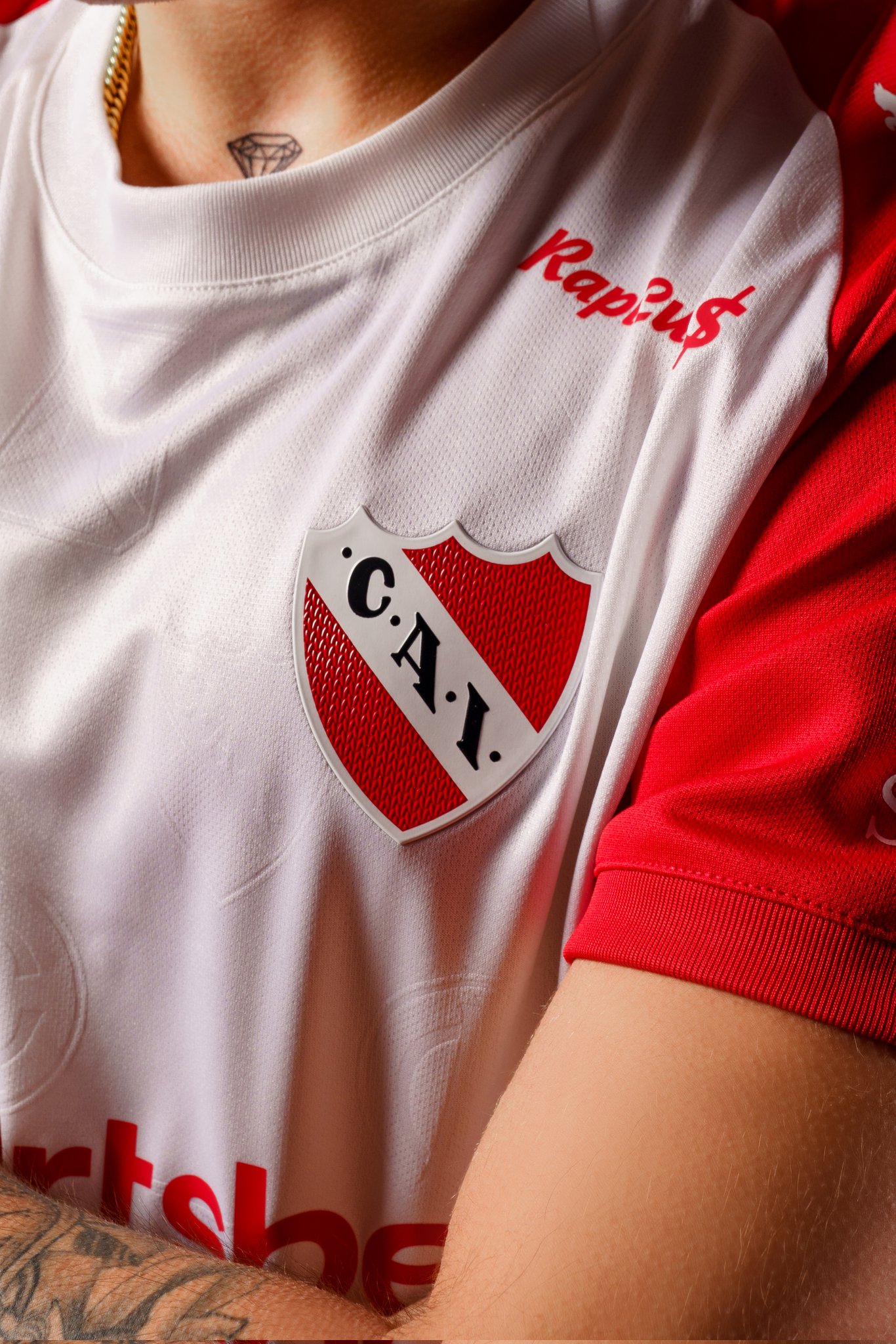 The Puma jersey has a white base with red sleeves and side panels, reflecting the colours of the club’s historic flags. Embossed throughout the fabric is a pattern featuring various versions of the Independiente crest used across its history.