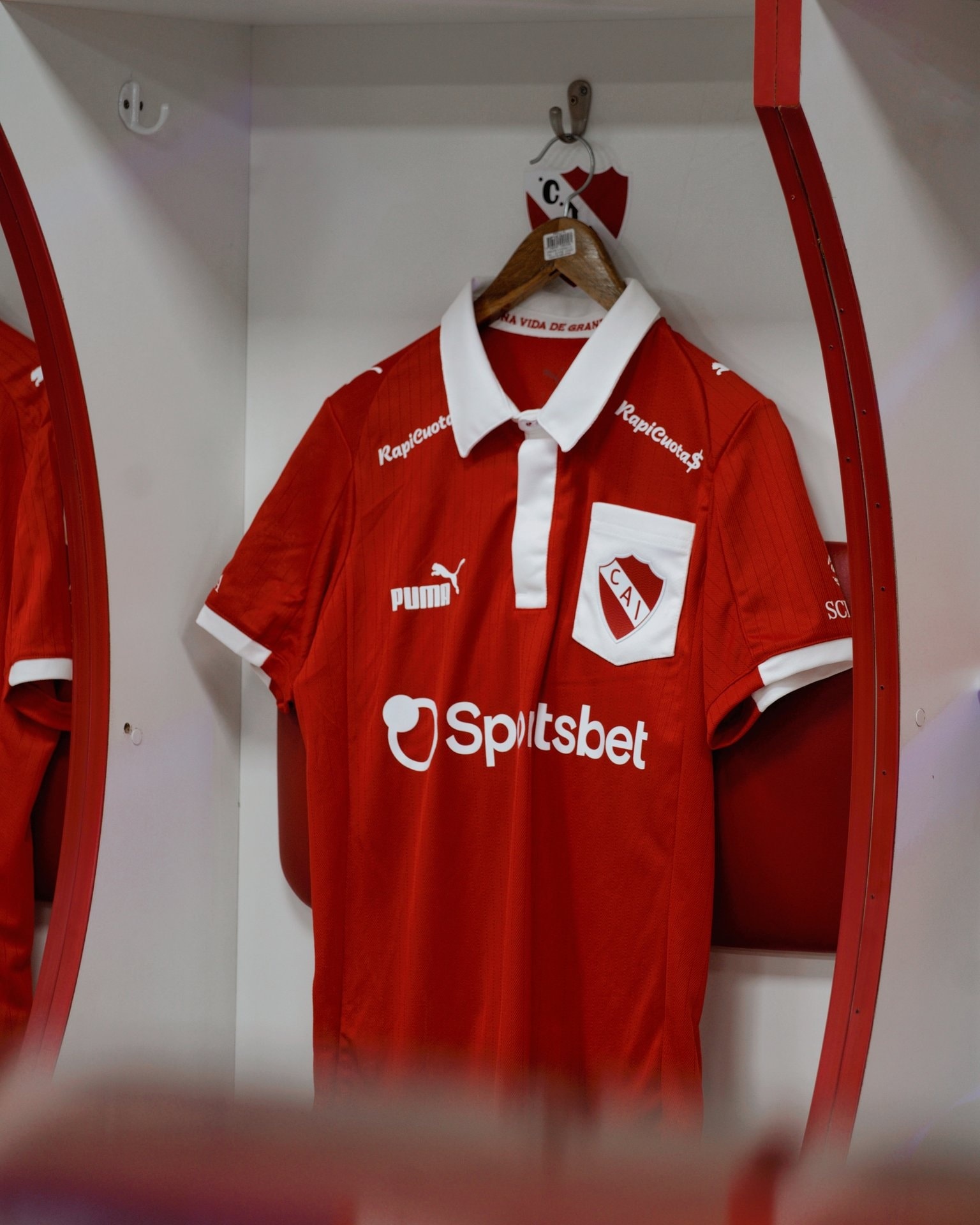 The base of the shirt is red with subtle vertical detailing, complemented by white sleeve trim. Puma branding appears on the front and sleeves, while sponsor applications are positioned in white. Inside the collar, tribute text references the club’s legacy, linking the current generation to Independiente’s long continental record.