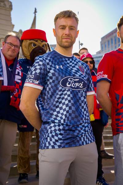 The design, a nod to the city’s racing heritage, features a wavy blue and navy checkerboard pattern across the front and sleeves. The collar has a white trim, while red and white detailing appears on the sleeve cuffs. The club’s crest sits on the chest alongside the Under Armour logo, with Ford as the main sponsor.