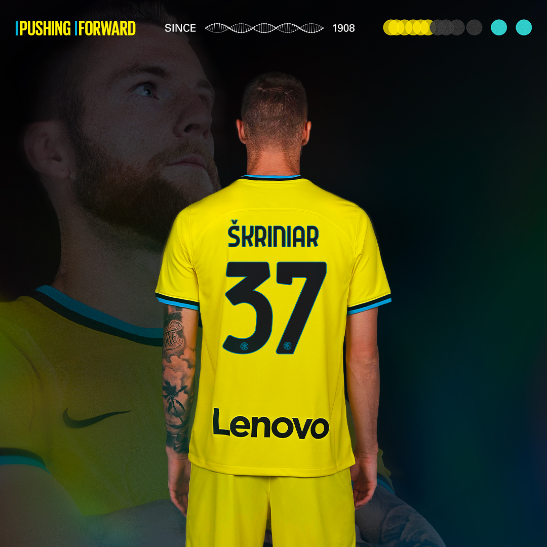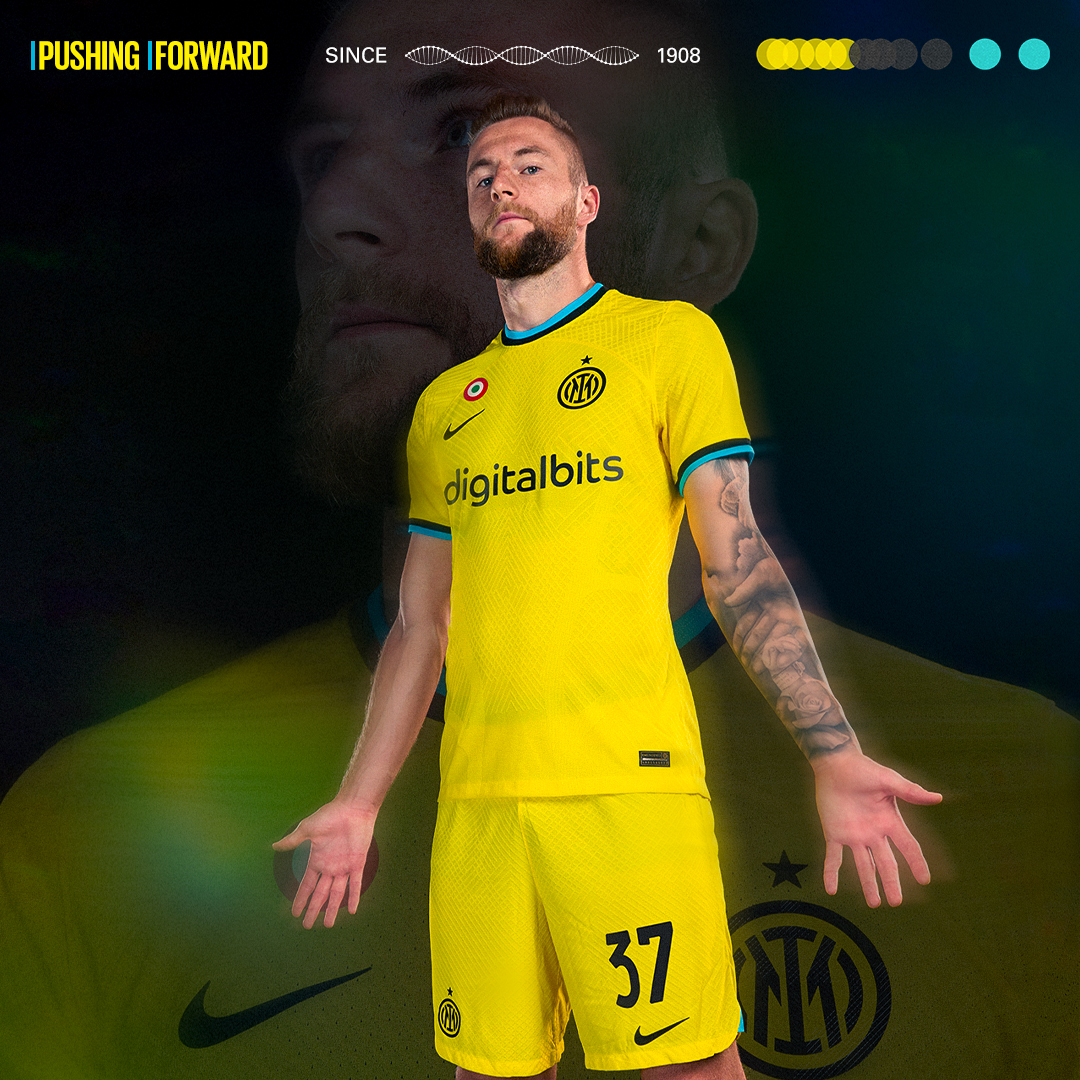 It is the new yellow, a vibrant and bright colour, introduced in 2021, that makes its debut on the Inter kit, in a sign of continuity with the shirts used by the team throughout its history.