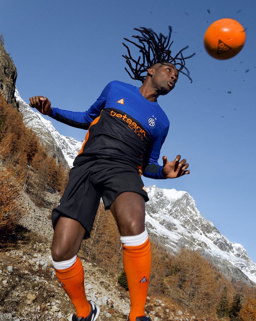 The Inter football shirt uses a crew neck collar while the reverse continues the same colour blocking, with additional Nike performance branding applied near the lower hem. The jersey will be paired with black shorts featuring blue and orange detailing, alongside matching orange socks to complete the full fourth kit, which forms part of a wider Nike ACG collection that also includes training and lifestyle pieces.