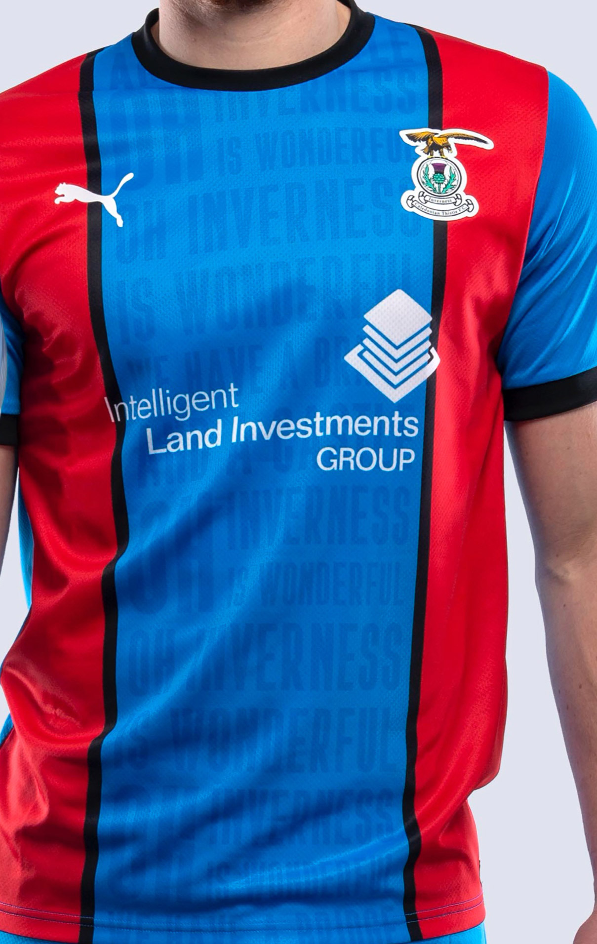 Inspired by the fans who follow the Caley Jags both at home and on their travels, the “Inverness is Wonderful” song which inspires the team wherever they are in the country, is shadow woven into the centre panel of the new kit.