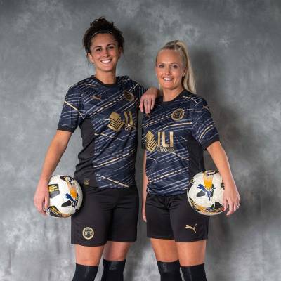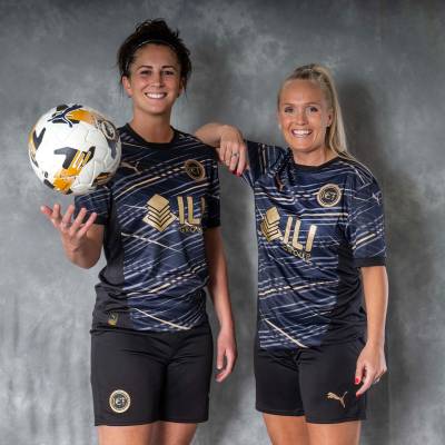 The special crest and partner/sponsor logos are presented in gold and the kit is completed with black shorts and socks.