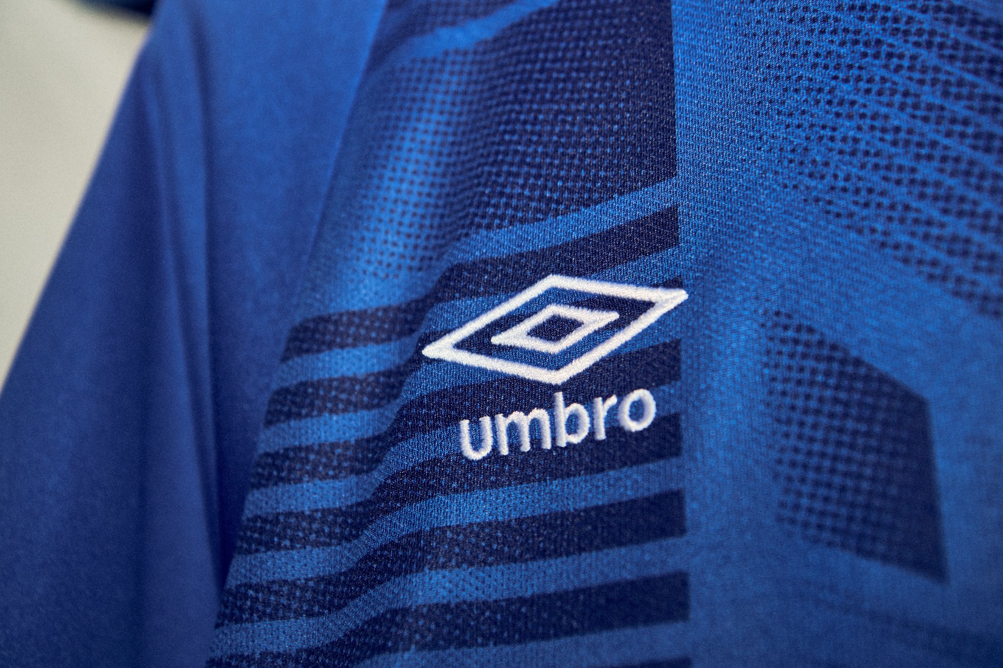 The blue home jersey features a distorted linear graphic, inspired by the architectural lines and structure of the Cobbold Stand at Portman Road.