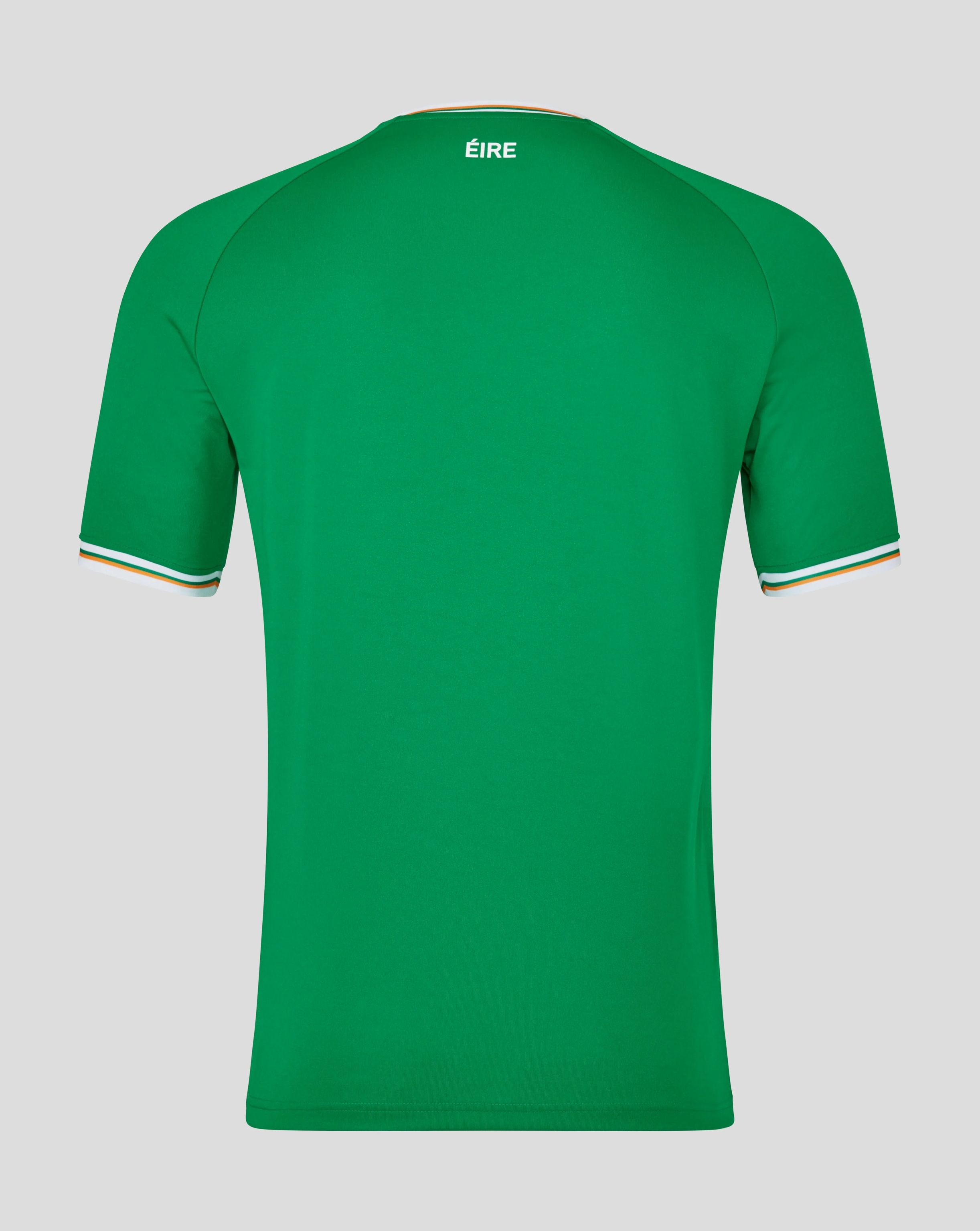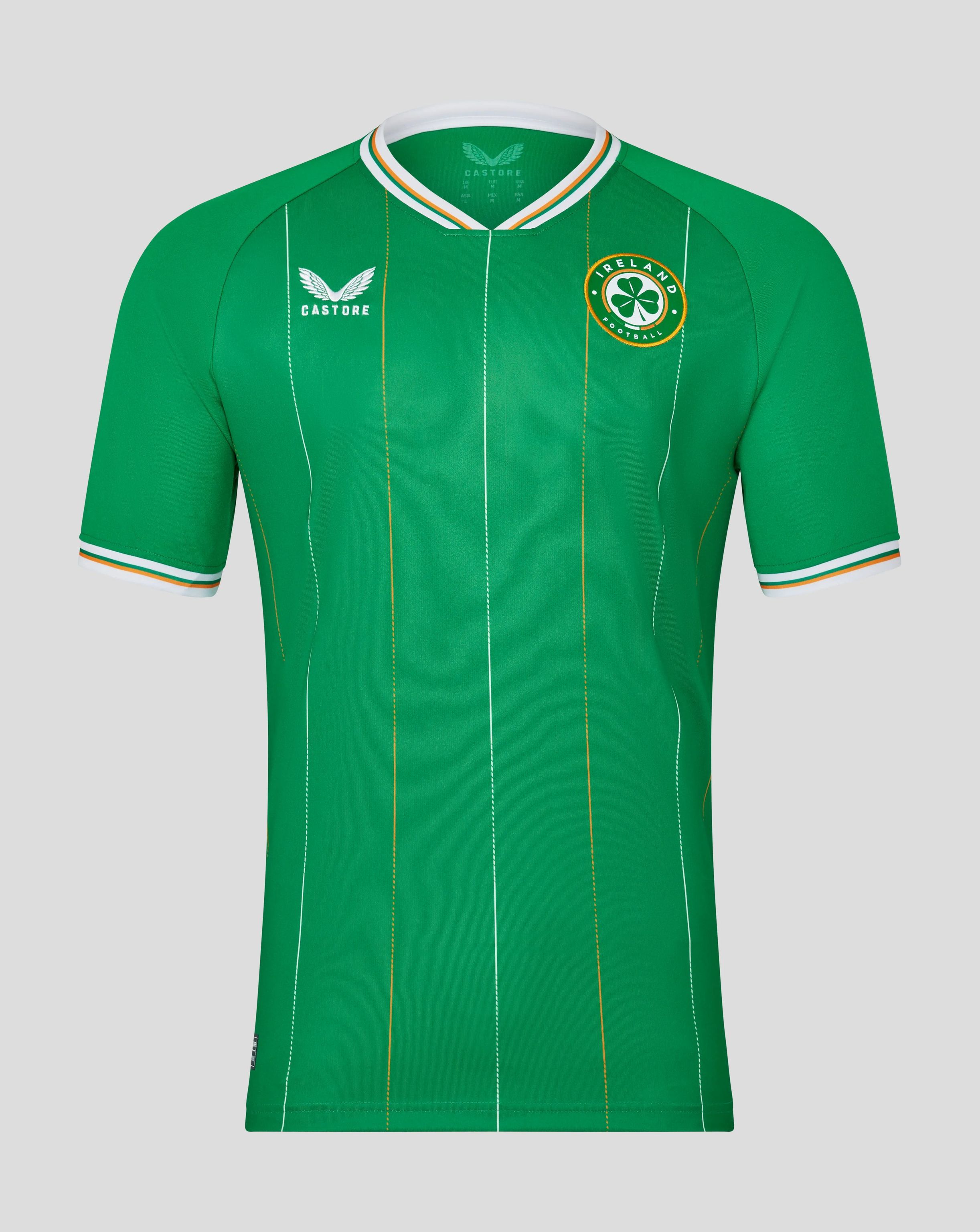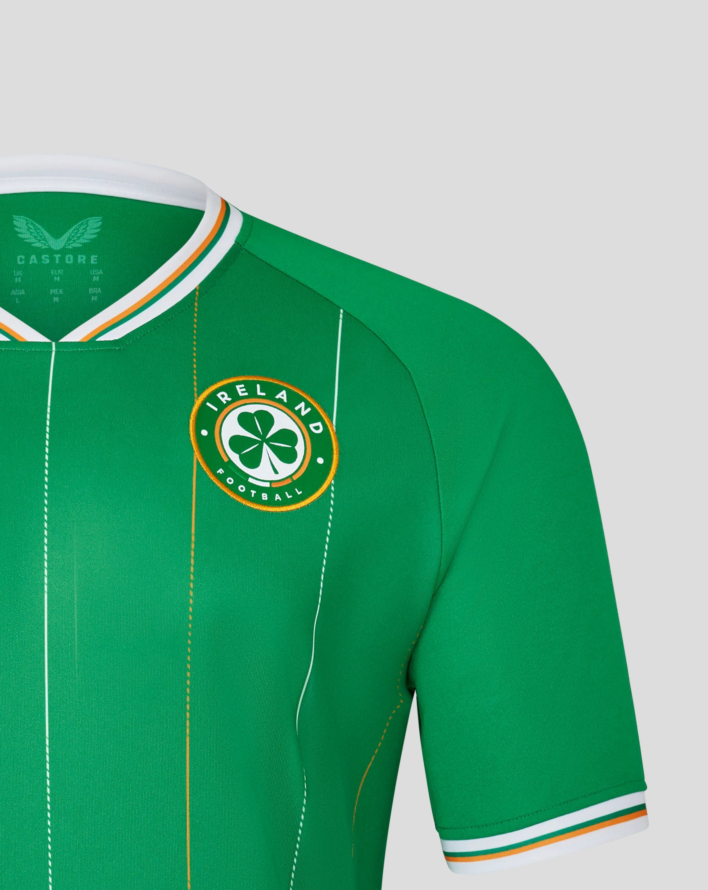 The new crest prominently displays a three-leaf clover, underscored by the Tricolour, honouring Ireland's most iconic symbols. The word "EIRE" lends a patriotic touch to the back neck, while the Castore wings finalise the ensemble.