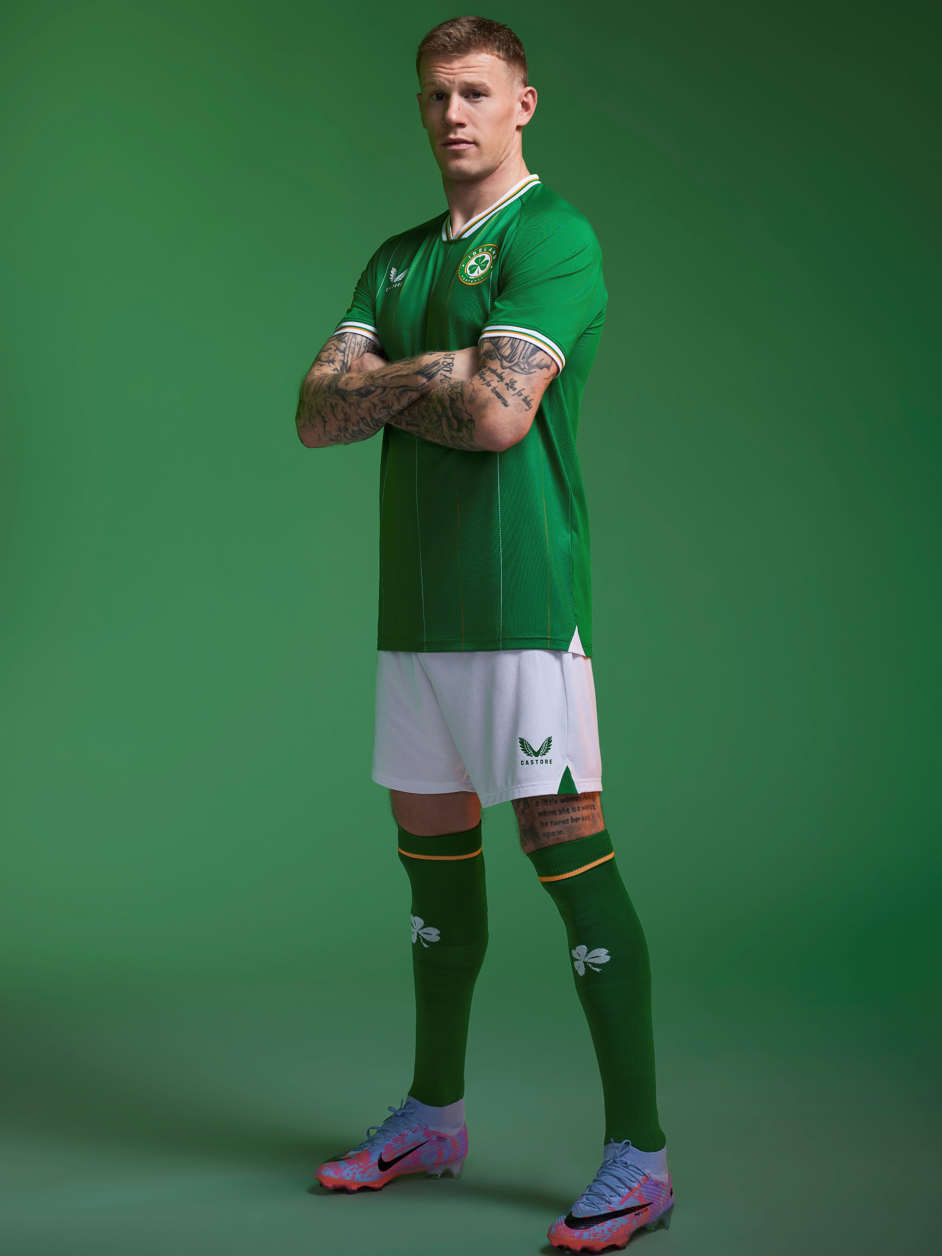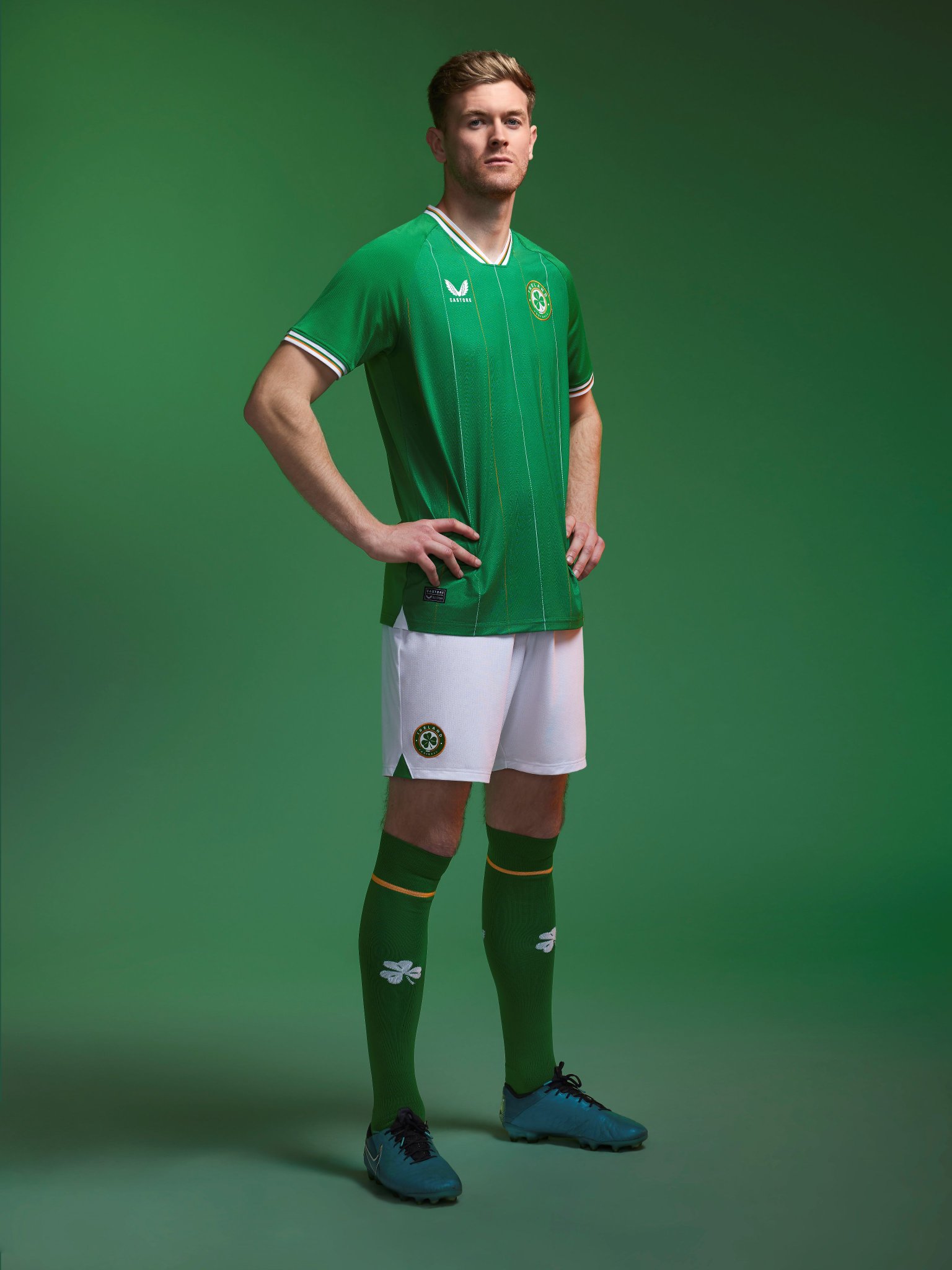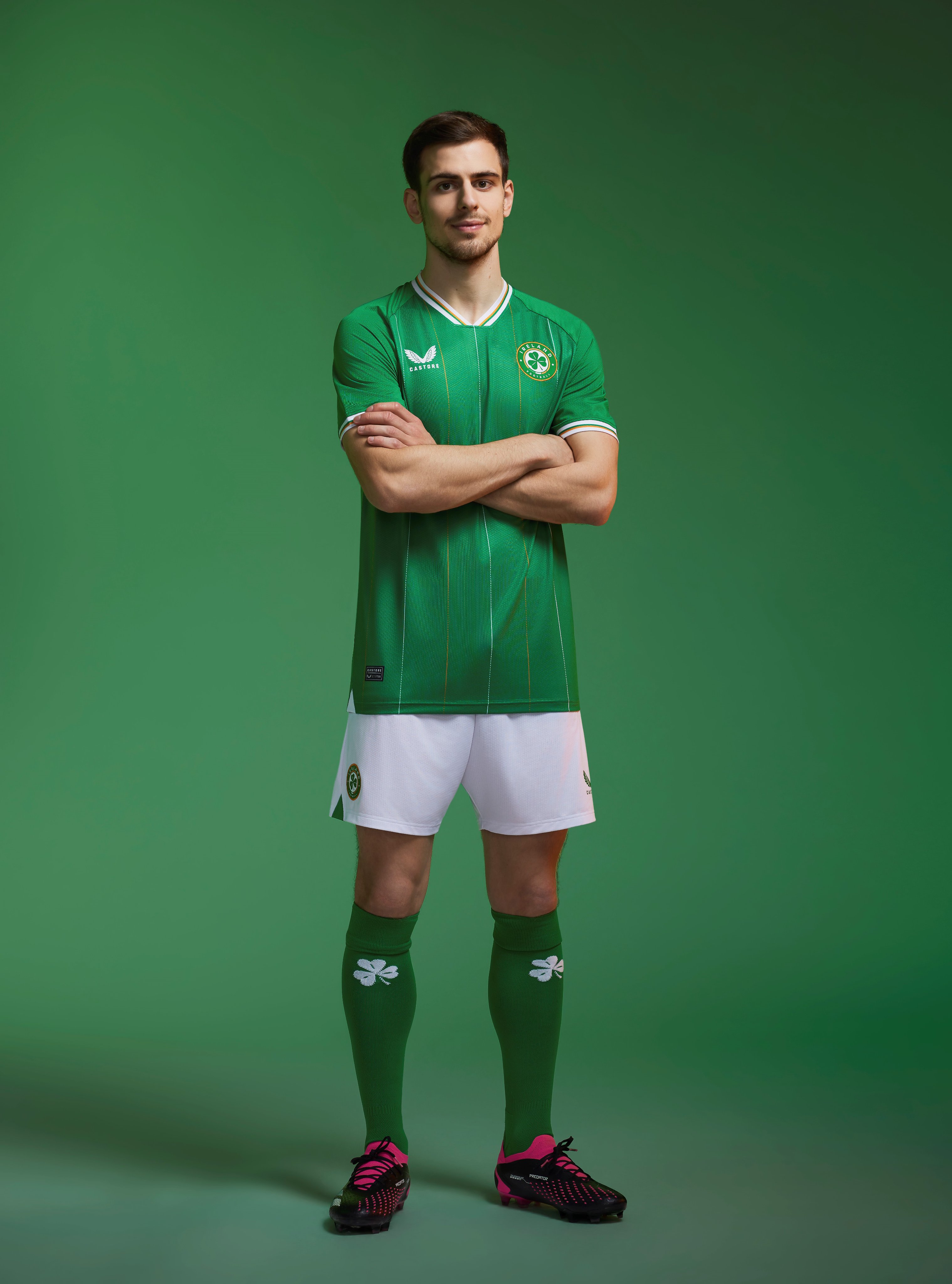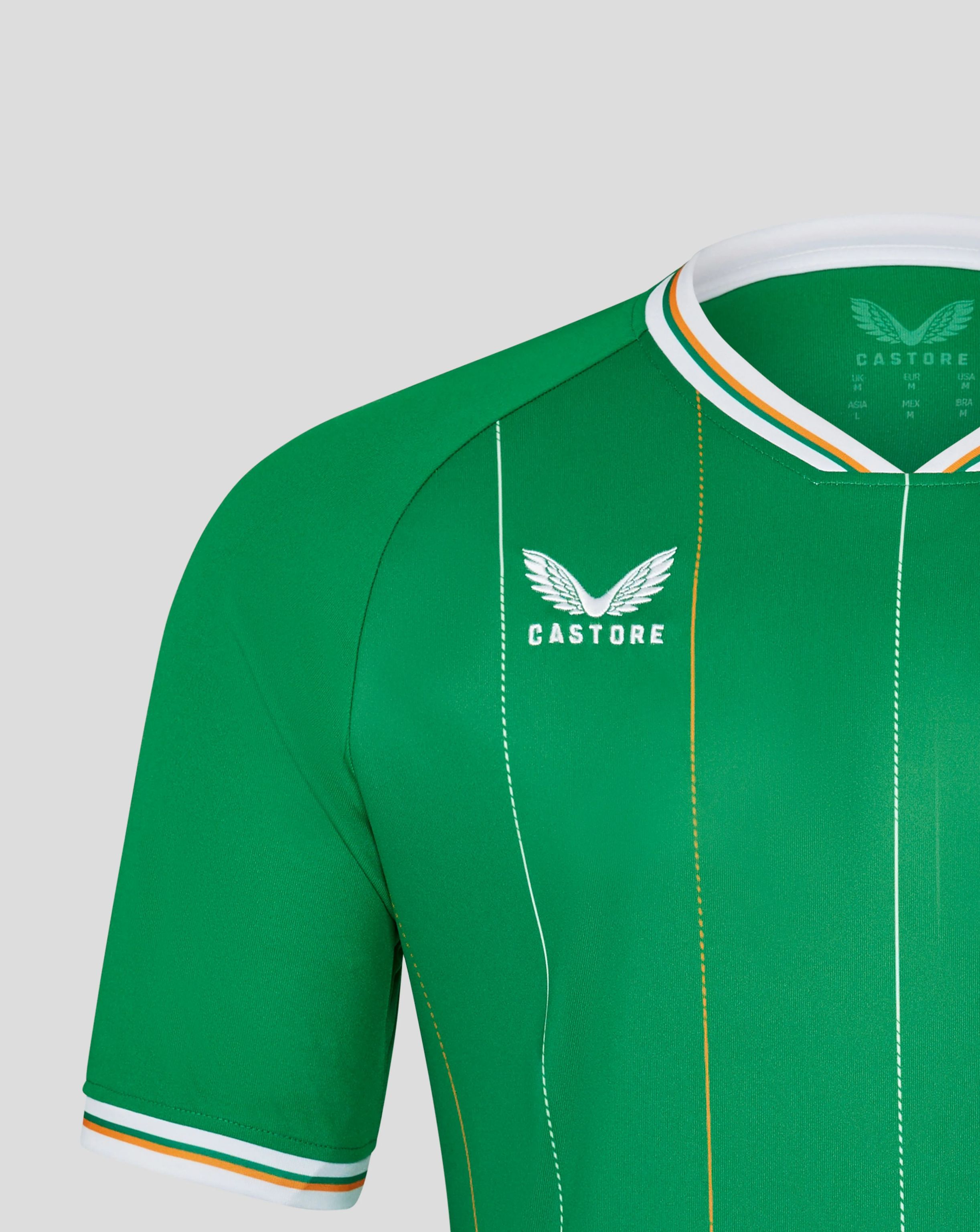 The new crest prominently displays a three-leaf clover, underscored by the Tricolour, honouring Ireland's most iconic symbols. The word "EIRE" lends a patriotic touch to the back neck, while the Castore wings finalise the ensemble.