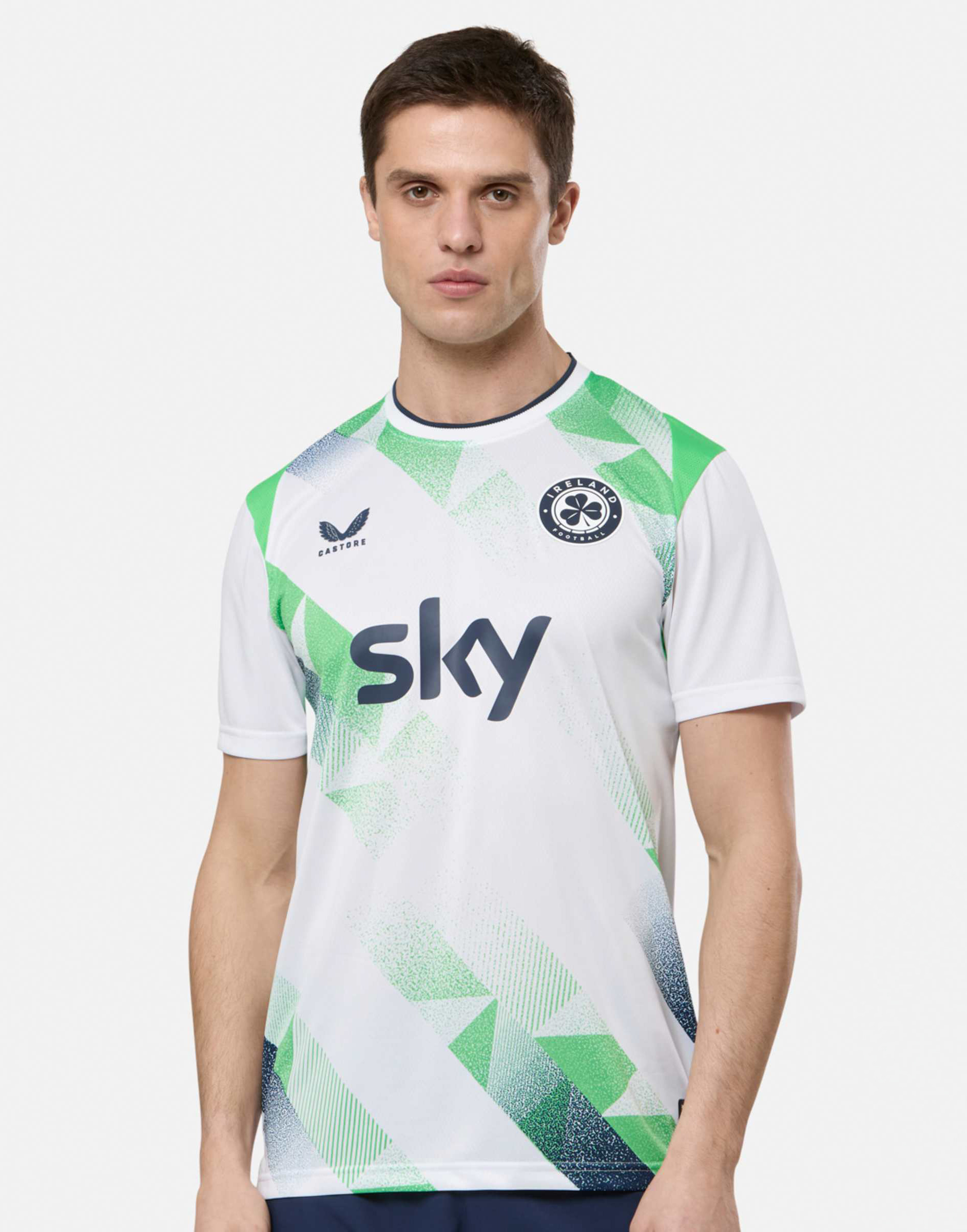 A round collar is finished in white with a dark trim at the neckline. The Ireland crest is positioned on the left chest, presented as a circular badge with shamrock detailing, while the Castore logo appears opposite. The Sky shirt sponsor is applied across the front in navy, with Castore Authentic Product labelling positioned near the lower hem.