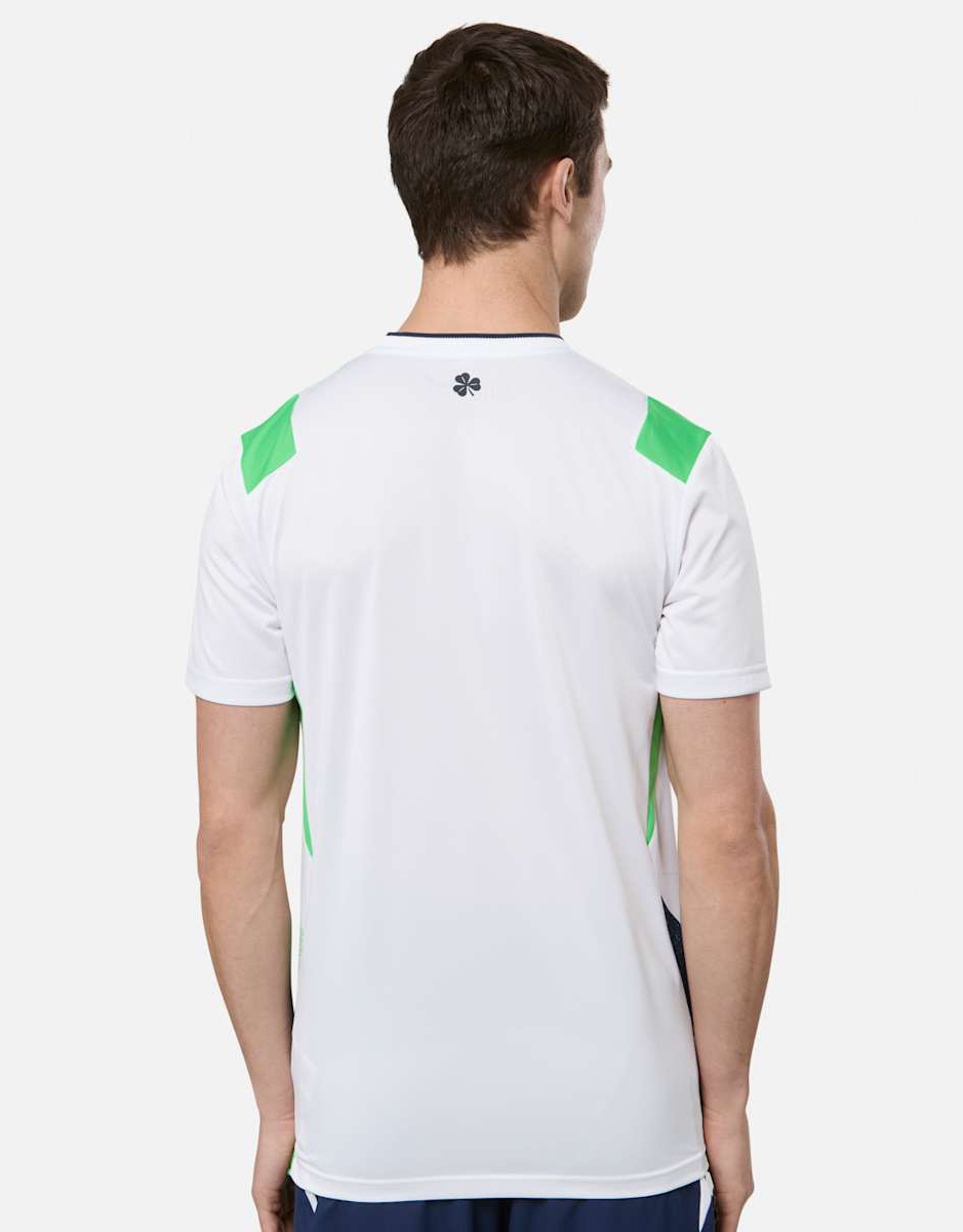 On the reverse, a small shamrock emblem is placed centrally beneath the collar, maintaining a consistent national reference across the home and away kits. The Ireland football shirt is constructed using lightweight materials intended for matchday performance, with breathable fabric panels supporting comfort during play.