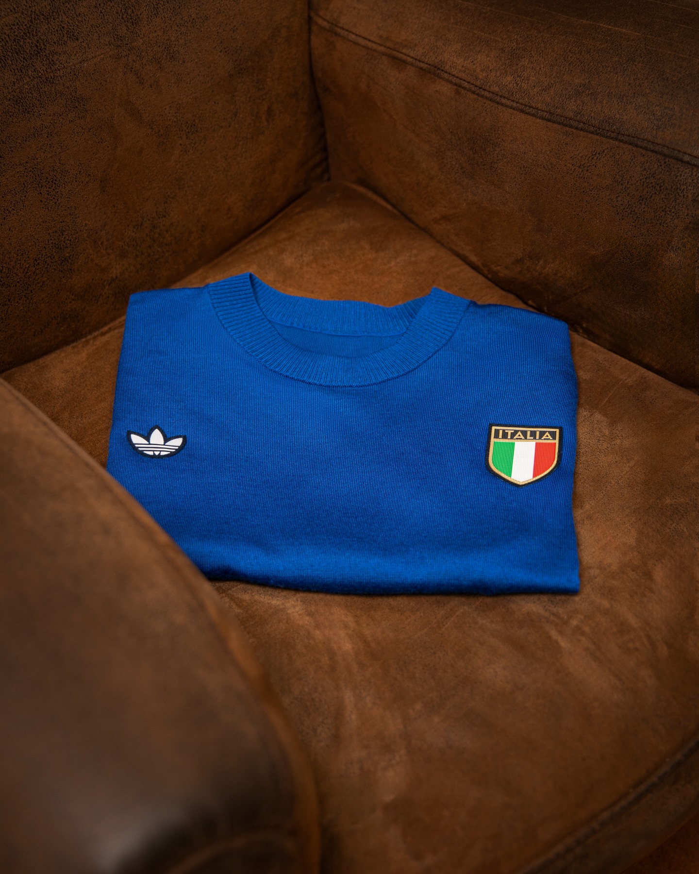 The adidas Trefoil logo appears on the right chest, positioned opposite the Italia crest, which displays the Italian tricolour shield beneath the Italia wordmark. Both emblems are applied in a raised finish. The back of the shirt remains plain, maintaining the understated aesthetic associated with 1970s international kits.