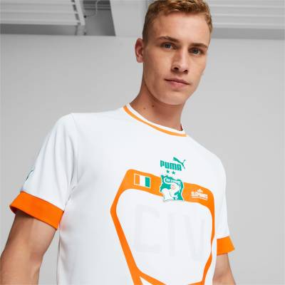 The nation and the national team are one in the Côte d'Ivoire Away kit. Bold graphics at the centre combine the national flag, federation emblem, and the team nickname “Les Éléphants,” paying tribute to Côte d'Ivoire’s national animal.