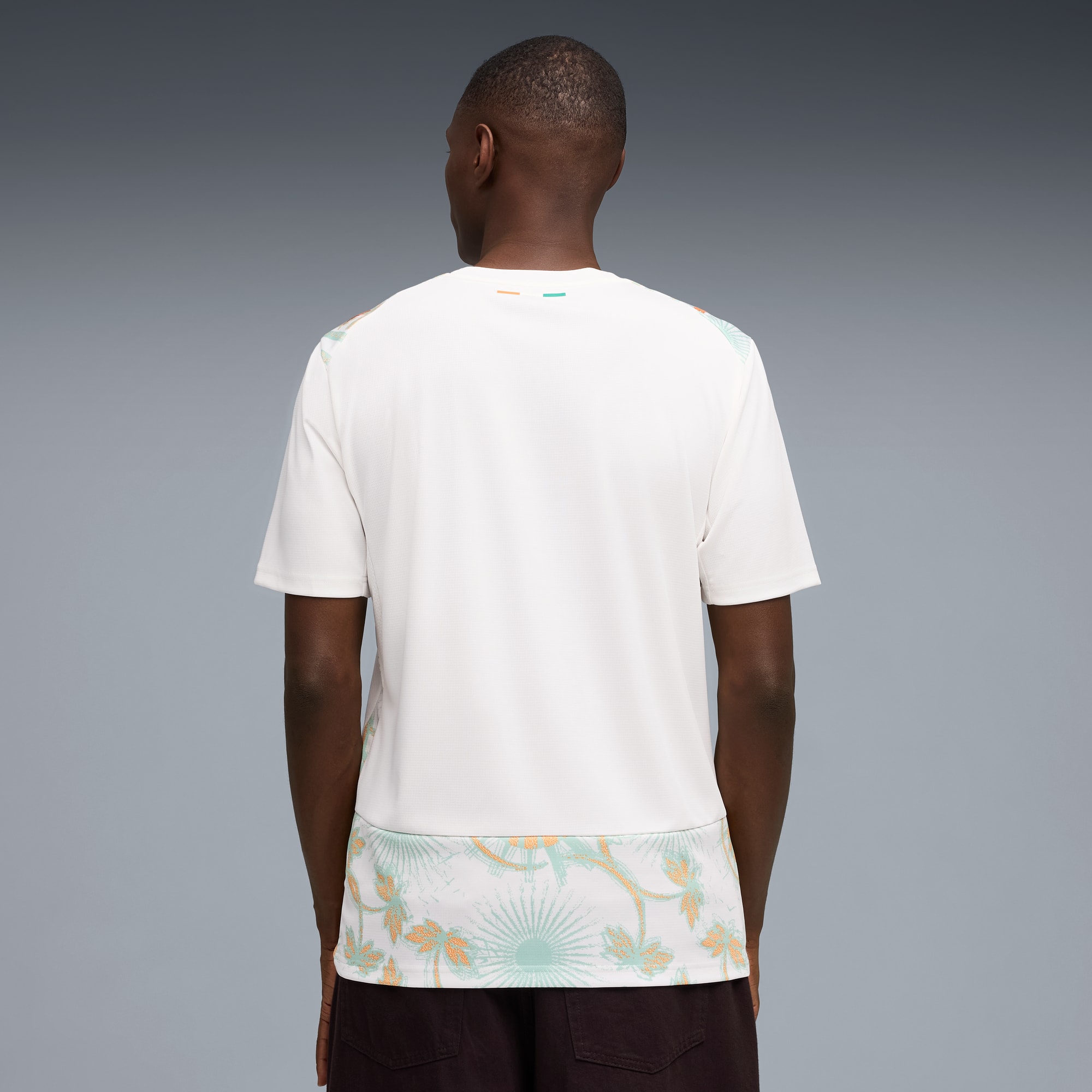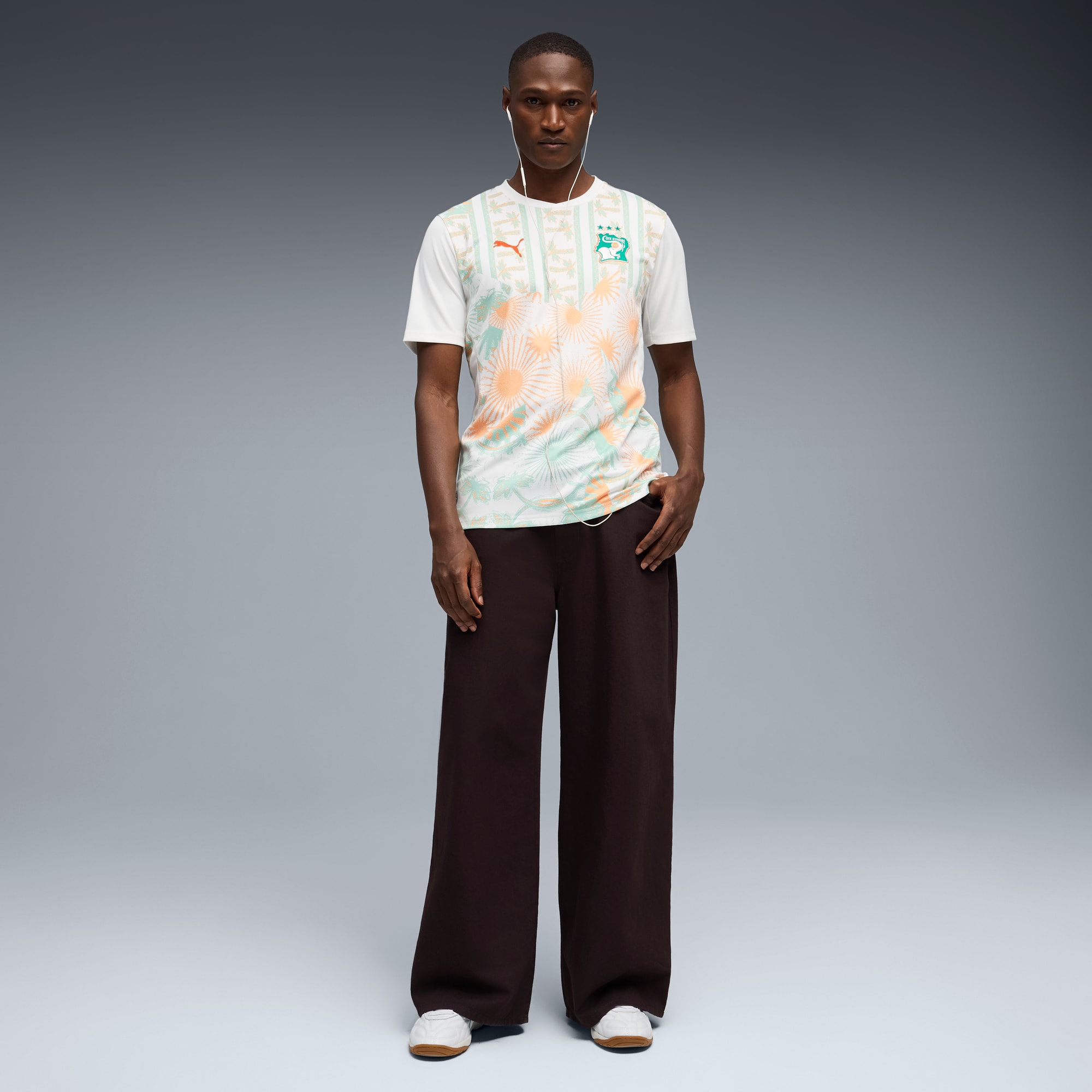 A white crew neck collar is used, with matching white sleeves kept clean in contrast to the patterned body. The Puma logo appears in Warm Chestnut on the right chest and shoulders, while the Côte d’Ivoire crest is positioned on the left chest. A small national flag detail is placed on the upper back below the neckline.
