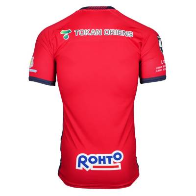 In Japanese script, the right sleeve carries the names of Iwaki City, Hirono Town, Naraha Town, Tomioka Town, Kawauchi Village, Okuma Town, Futaba Town, Katsurao Village and Namie Town, while partner logos introduce more colour and the shorts and socks that complete the kit are in Minato Blue and red respectively.