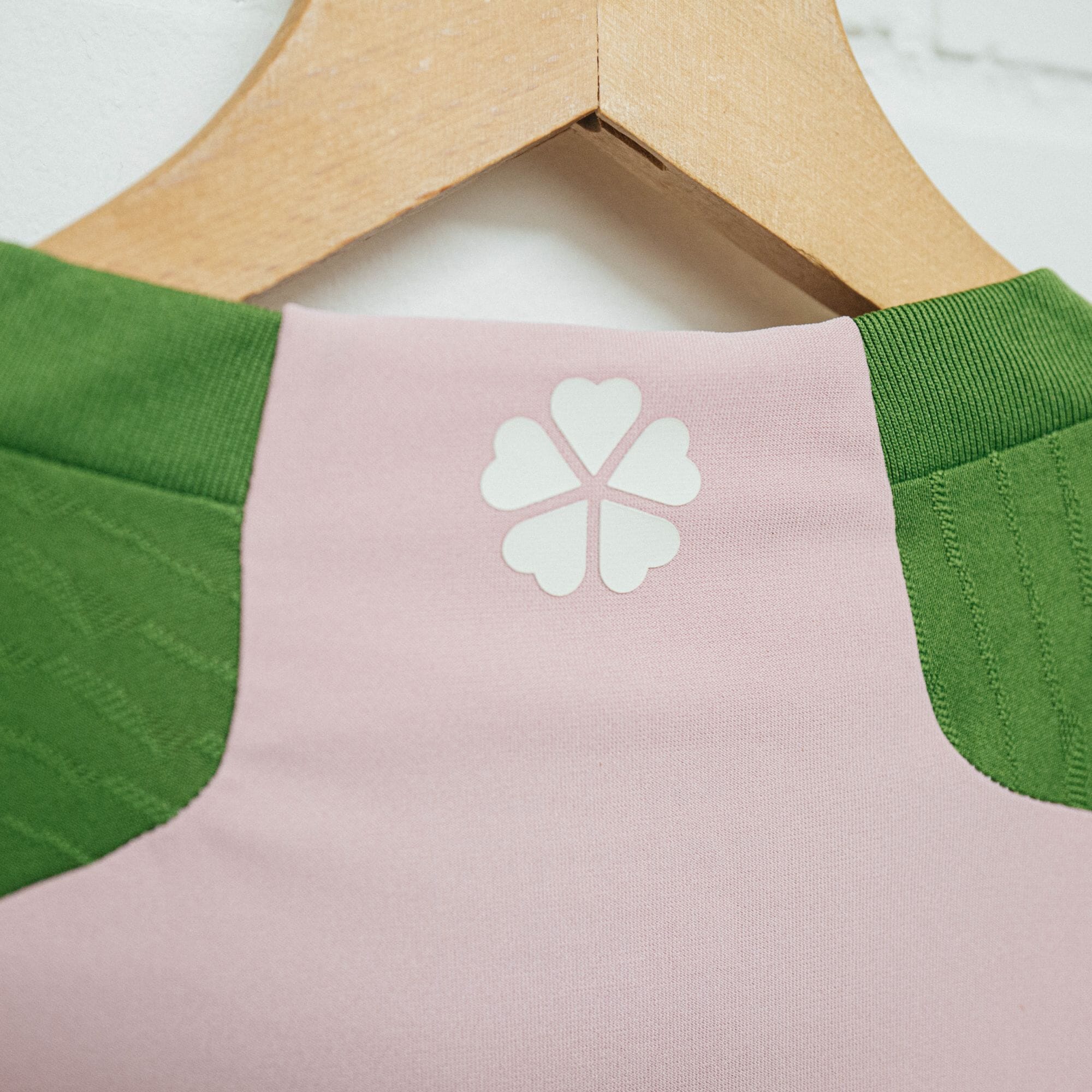 The 2022 release, in “Wonder Mauve” and “Crew Green”, combines the pink hue of the trunk with sleeves in said green, while the detailing is in a deep burgundy and the adidas stripes are in white.
