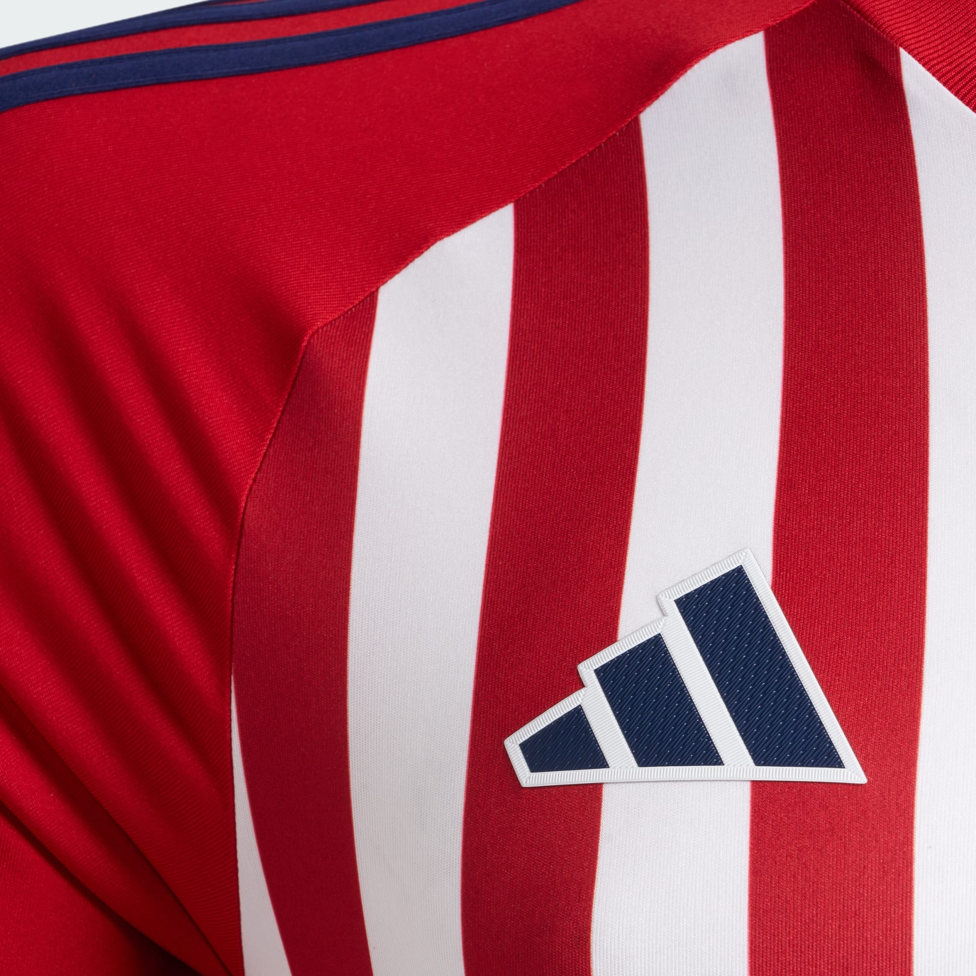 The red-and-white-striped primary design for 2024 features the German supplier’s “3-Bar” logo on the chest and their stripes on the shoulders - both in navy blue - and the crest appears in full colour.