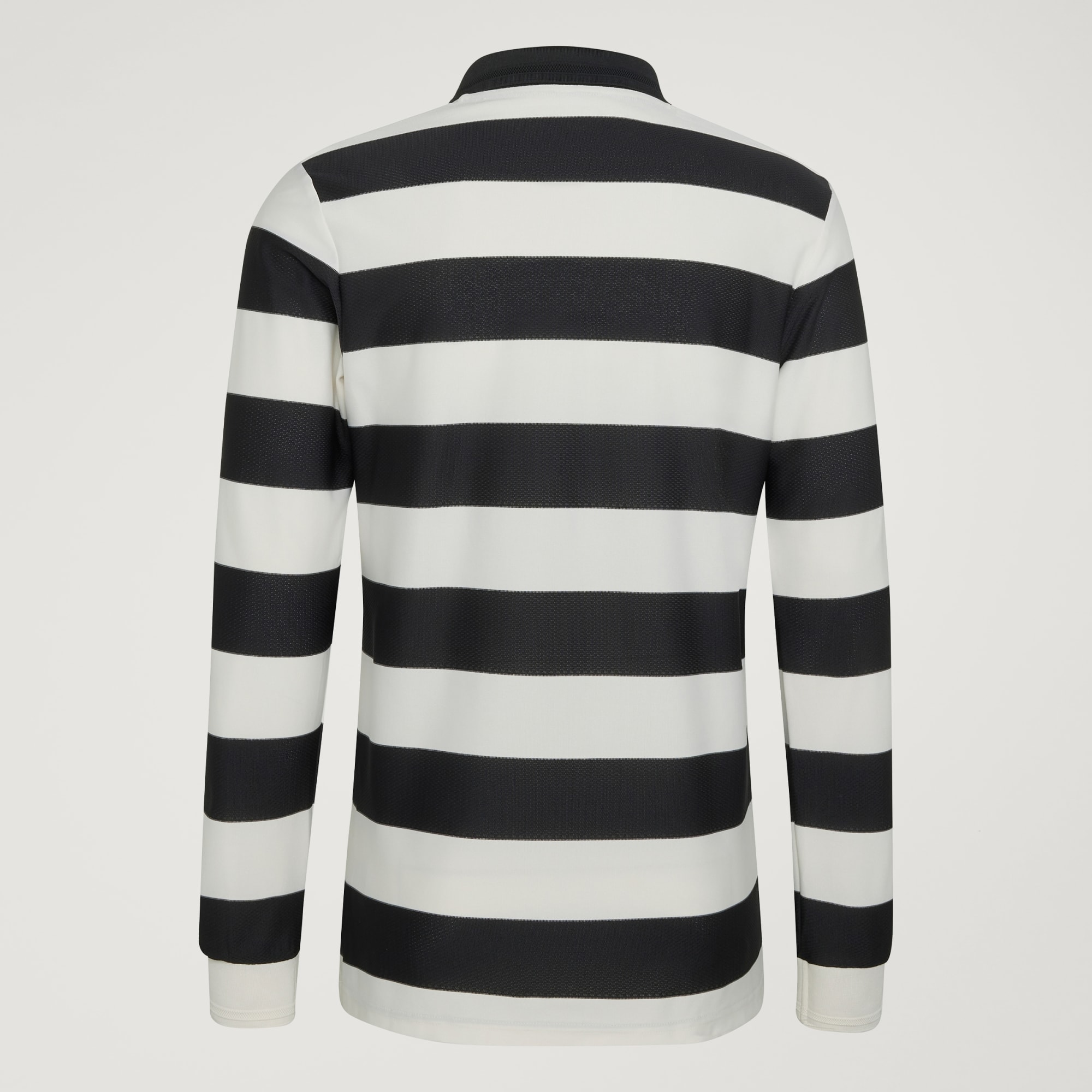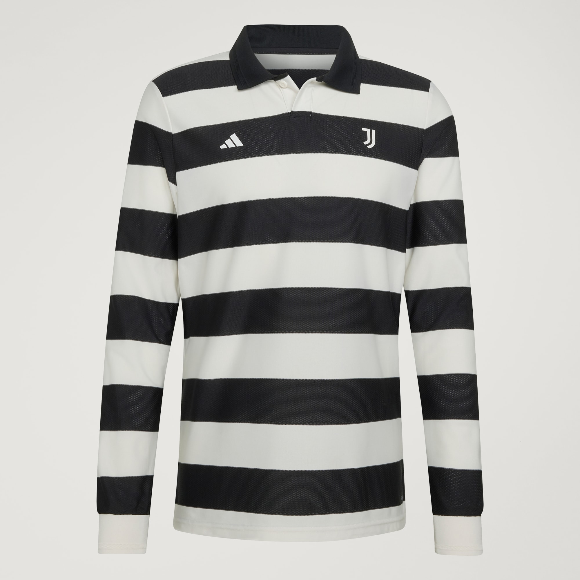 The new Juventus jersey features broad black and white hoops across the body and sleeves, referencing an experimental concept first explored during the 1996/97 season. A long sleeve construction returns, combined with a structured polo collar in black. The adidas logo appears on the right chest, with the Juventus crest positioned opposite.