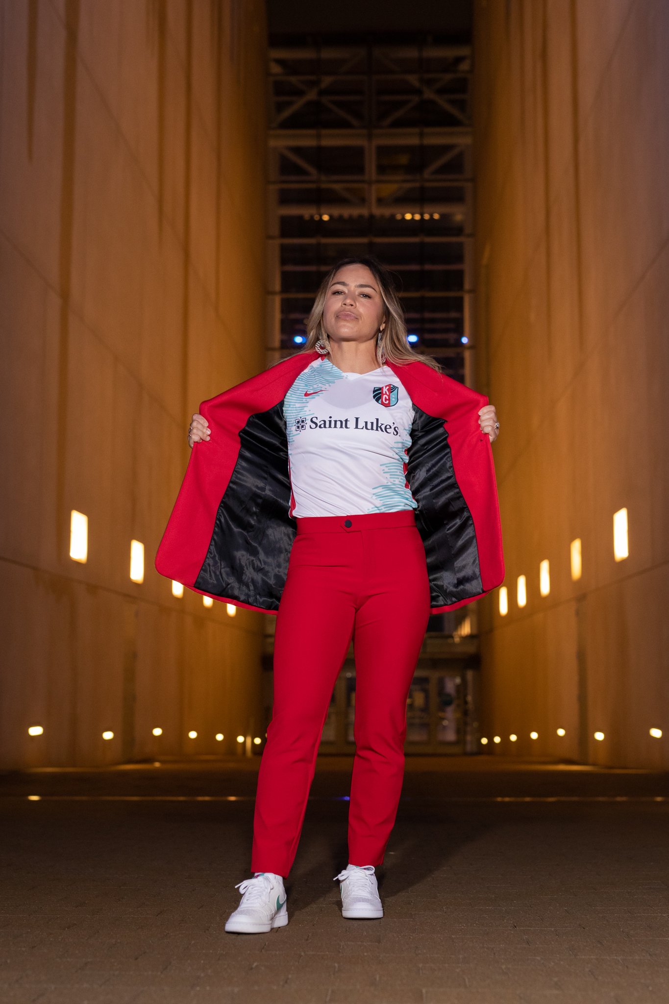 Accents of Heartland Red, including the iconic NIKE Swoosh and piping along the side and neck, symbolize the KC Current’s connection to the community, passion for the sport, and commitment to one another.